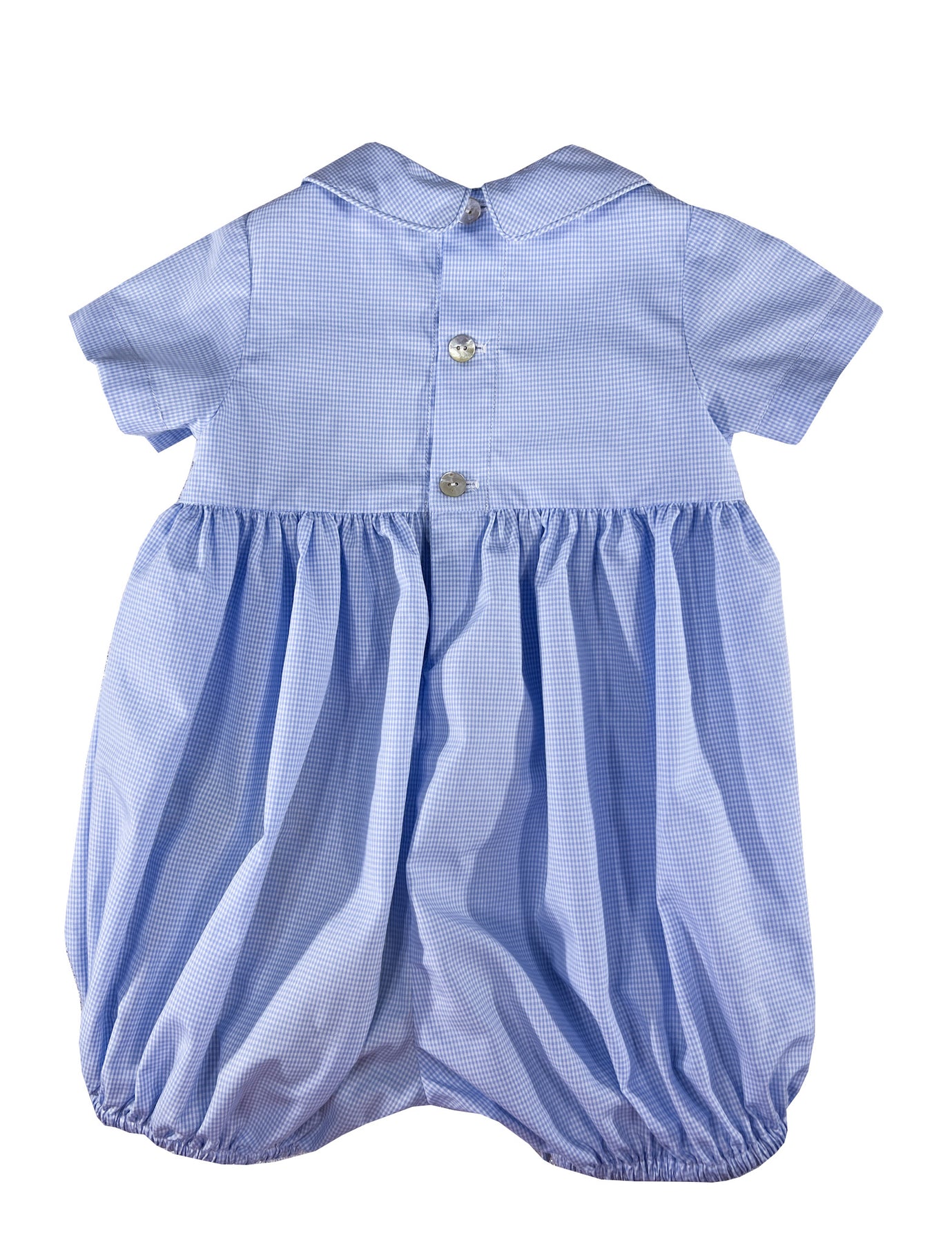 This blue bubble romper coordinates beautifully with its dress counterpart, featuring the same gentle mini checked blue and white satin cotton which recalls the freshness of early hours. The smocked chest band showcases intricate geometric patterns in blue tones, while the collar and short sleeves maintain the classic silhouette in miniature.