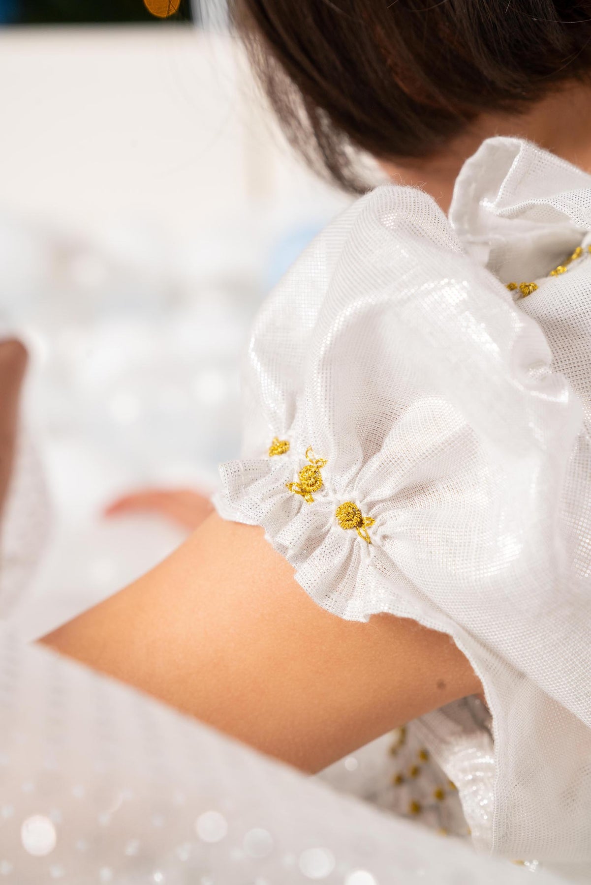 Its bodice, sleeves and butterfly bow sash are crafted in white cotton with subtle silver thread inserts creating a discreet, almost magical glow.