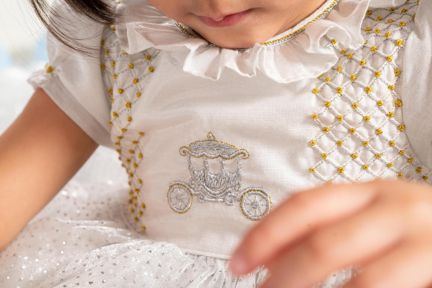 The chest is adorned with an enchanting silver royal carriage. Its golden wheels and ornate details shimmer as they catch the light. Delicate lattice-style embroidery in coordinating threads creates an elegant diamond pattern on either side, each intersection is adorned with a delicate French knot.