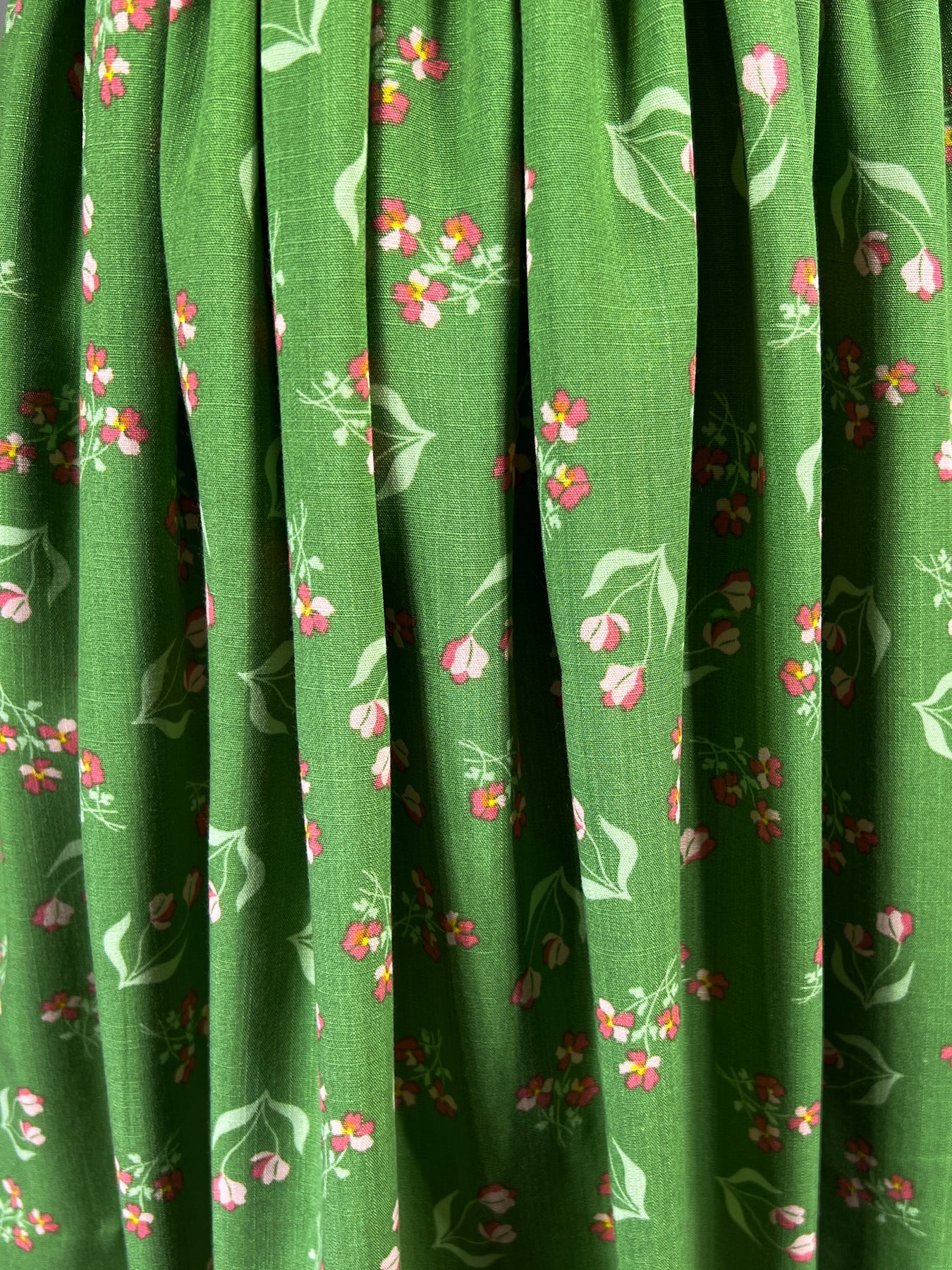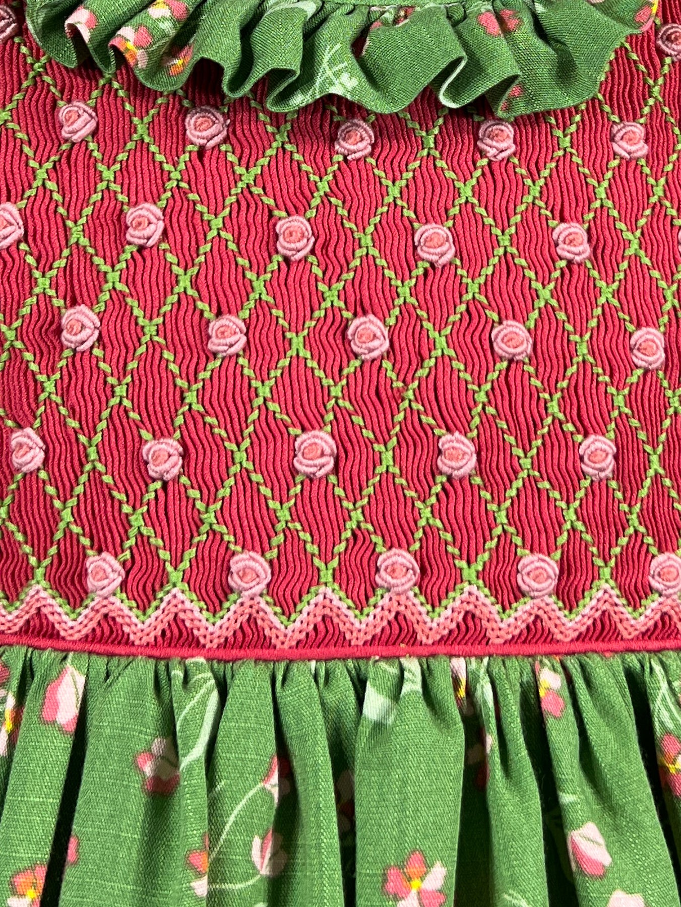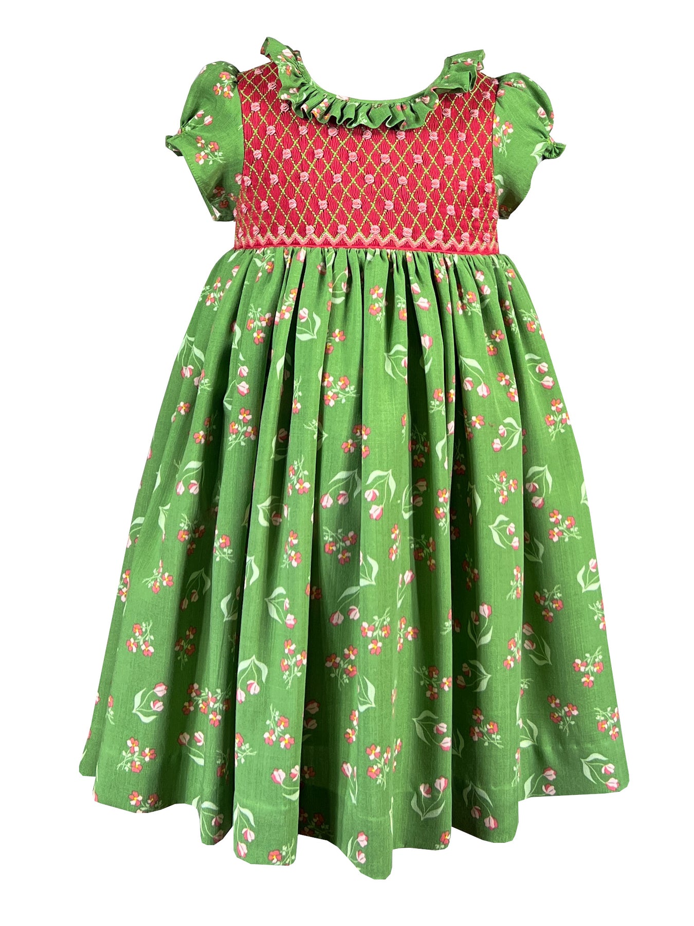 The Floral Wanderings dress captures the serenity of a springtime garden stroll. The fully smocked bodice in coral red extends gracefully from neckline to shoulder, featuring an elegant diamond lattice pattern where delicate rosebuds bloom at each intersection. Below, a vibrant spring green canvas hosts scattered coral and red florals with graceful stems and leaves, evoking the quiet discoveries found along a garden path.