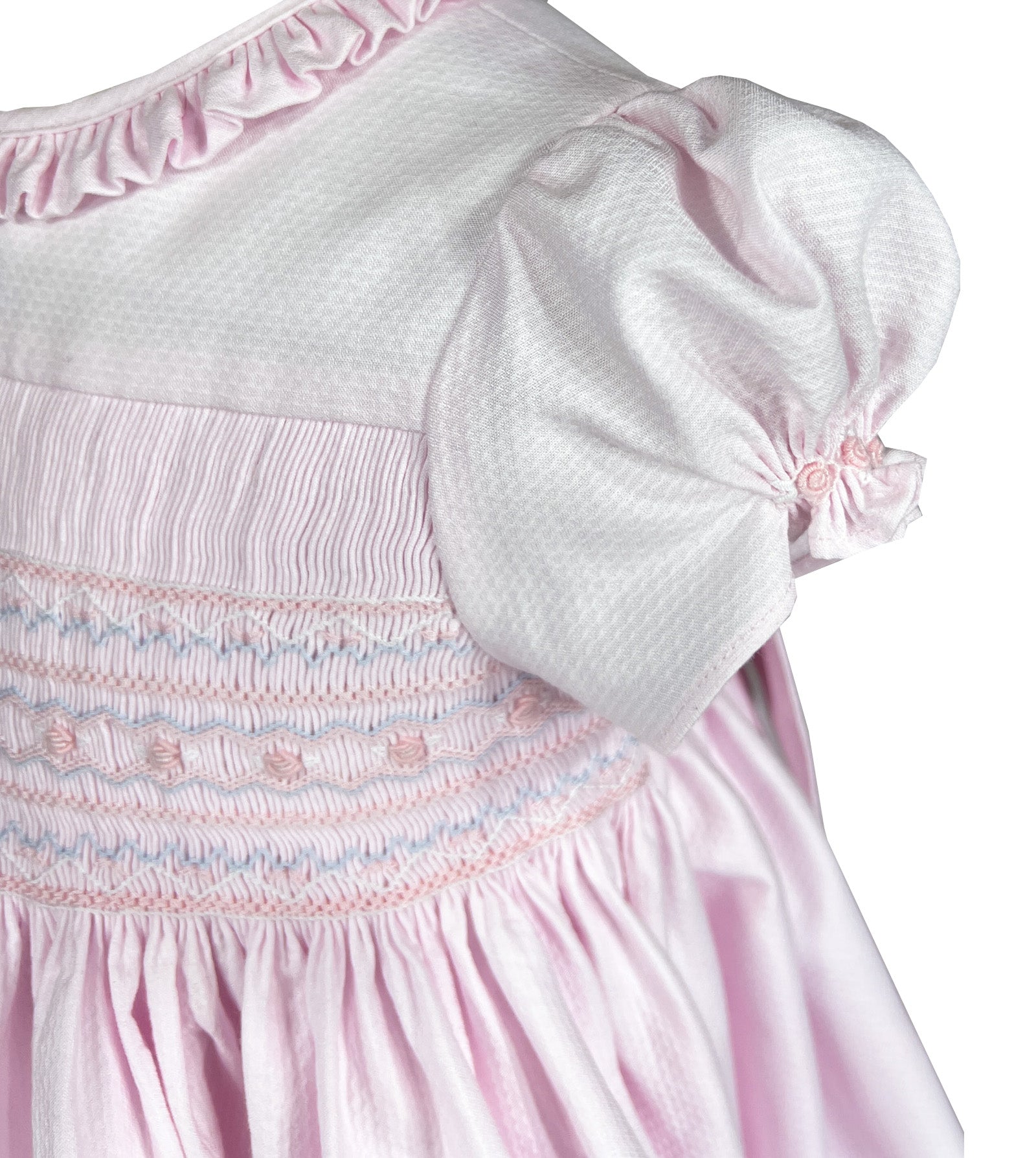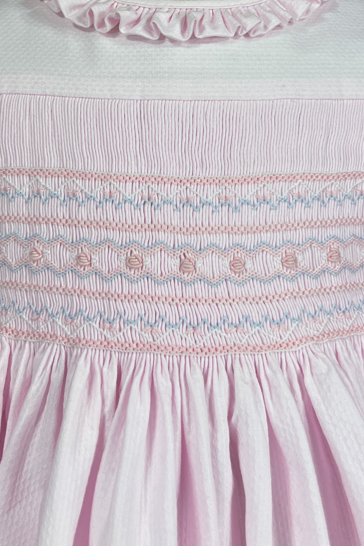 The exquisite hand-smocked bodice showcases intricate detailing in delicate pink and bluish grey threads. The romantic frilled pleated collar adds a sweet feminine touch, while the puffed sleeves feature rosebud embroideries at the cuffs.