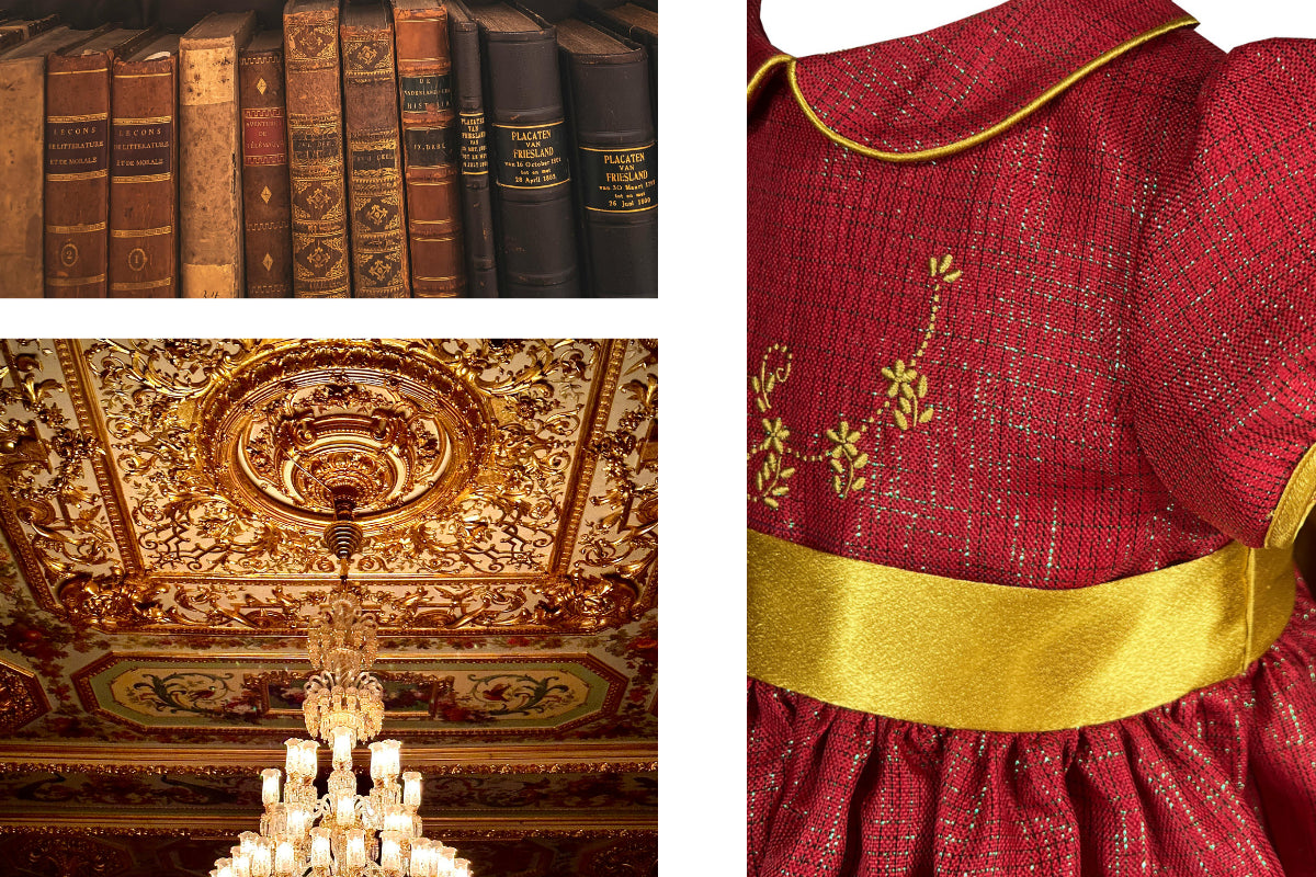 Inspired by the magnificent leather-bound tomes found in grand château libraries, this regal dress captures the timeless elegance of gilded book spines lined on mahogany shelves. The rich crimson fabric shimmers with delicate golden threads woven throughout, creating a luminous texture that catches the light like precious sunlight on antique volumes.