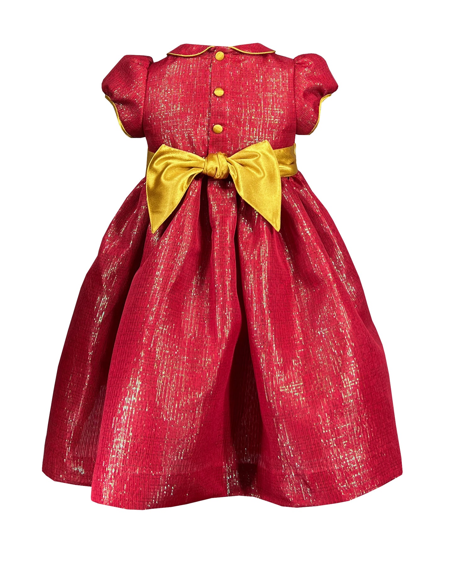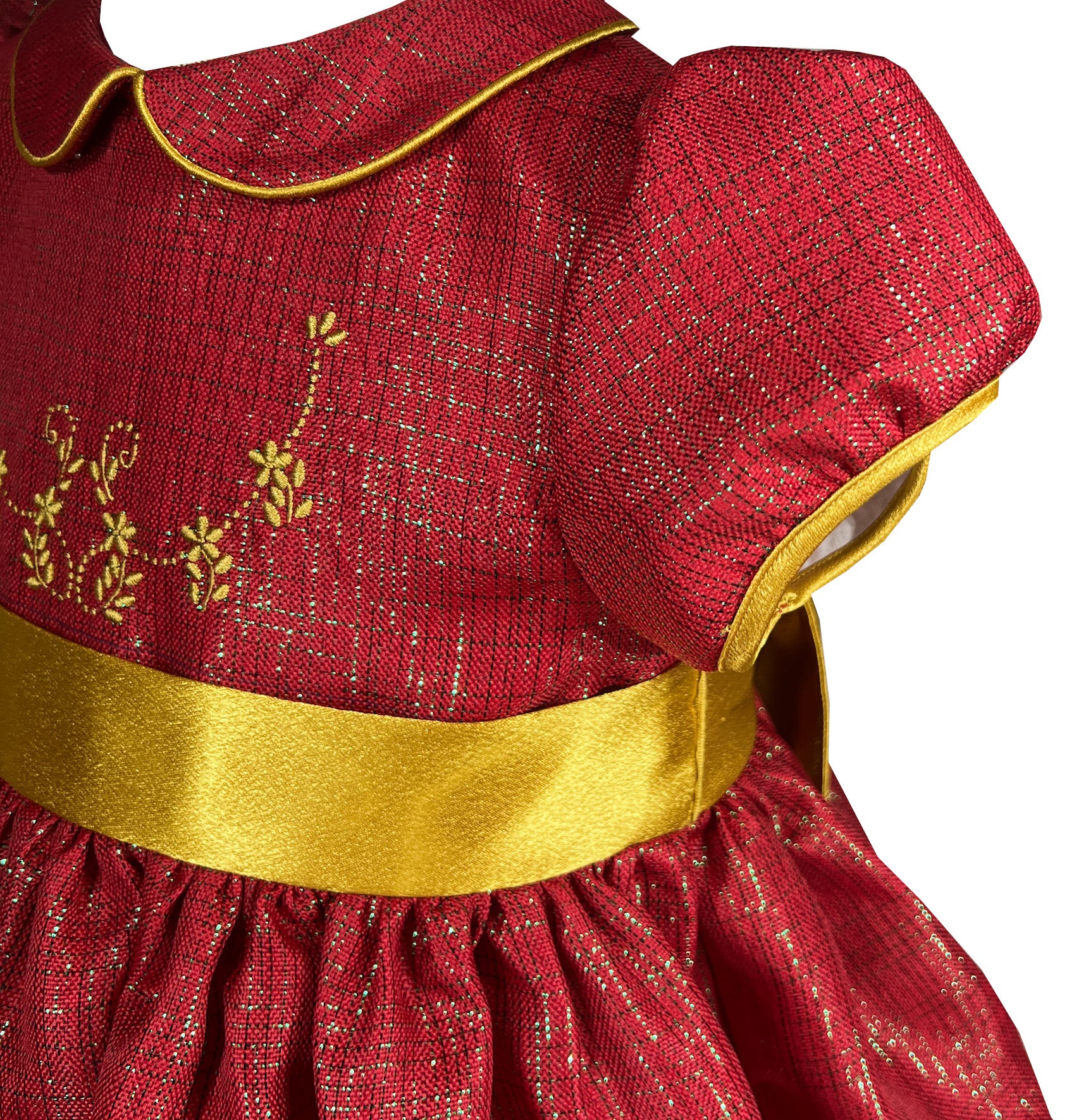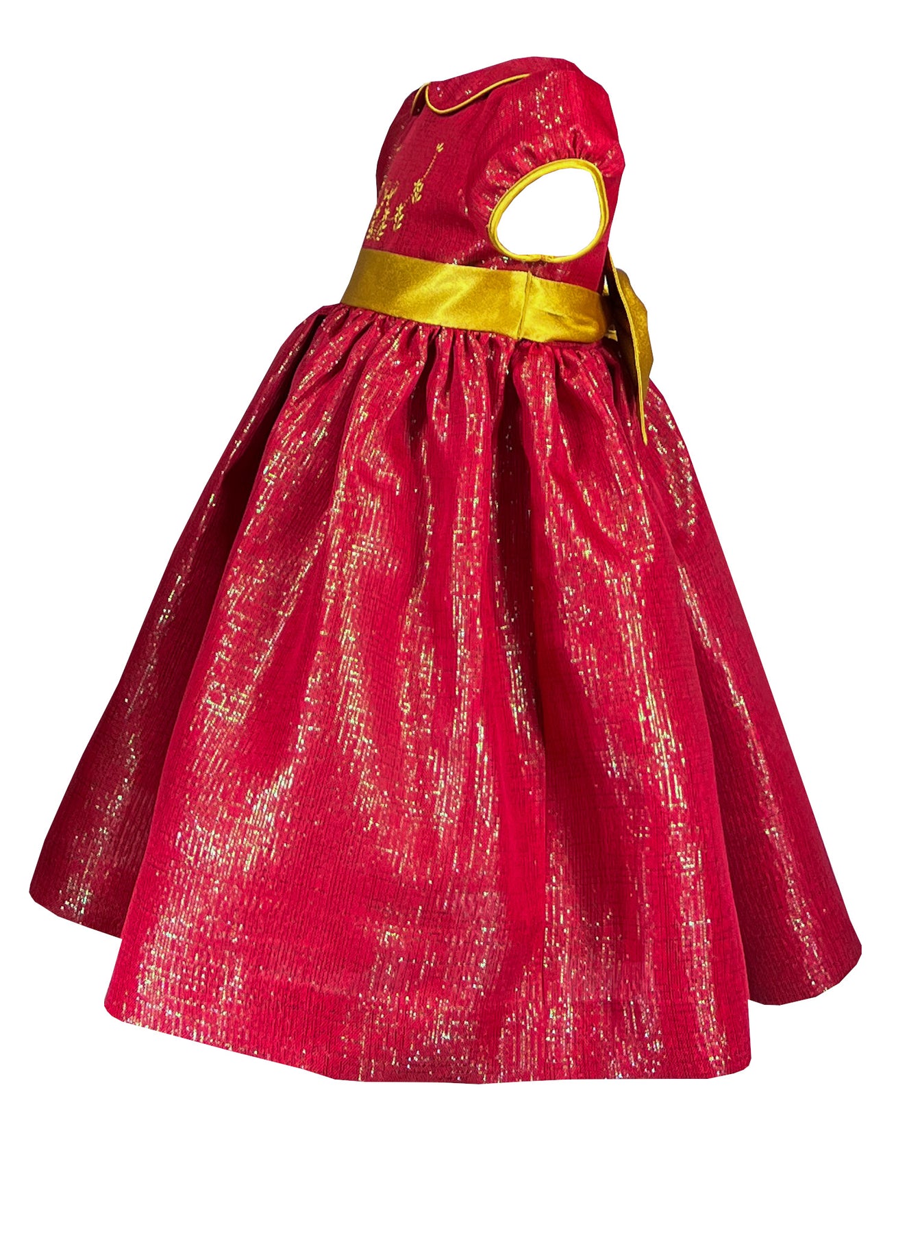 Composition : Crimson fabric blend with golden metallic threading. Golden satin sash with butterfly bow. This dress requires no steaming or ironing.
