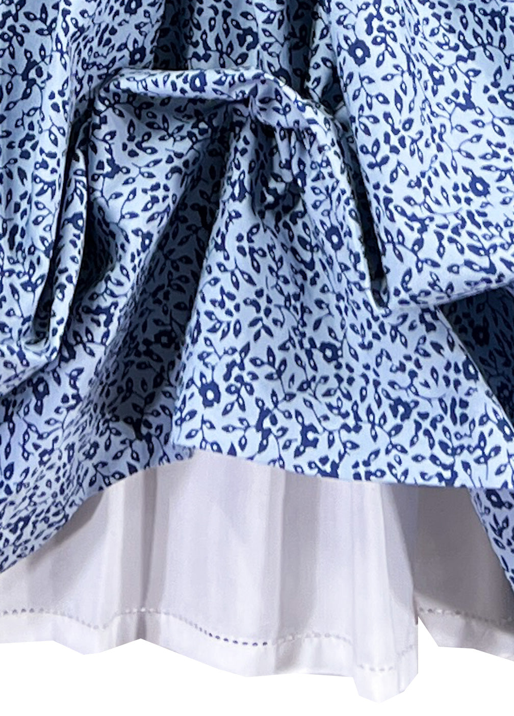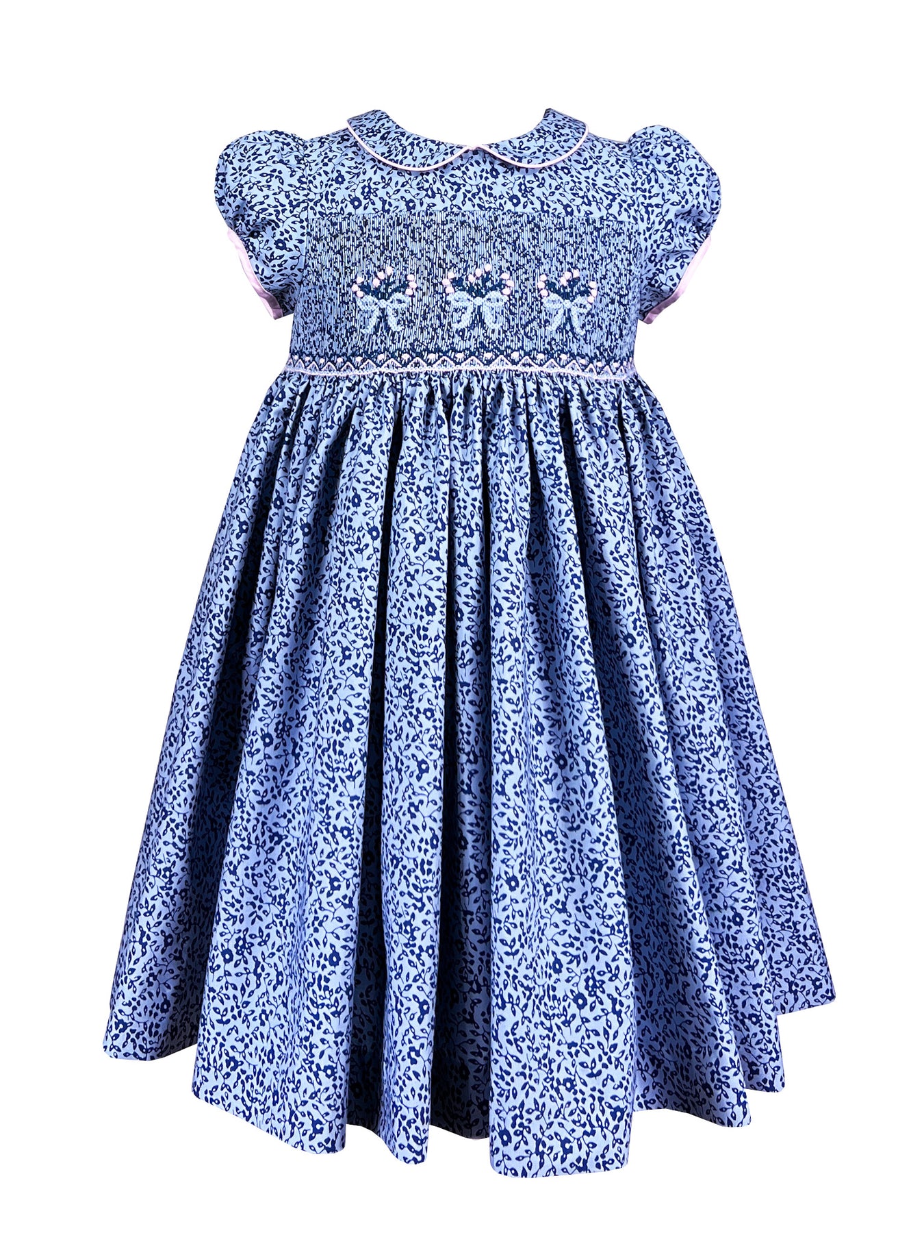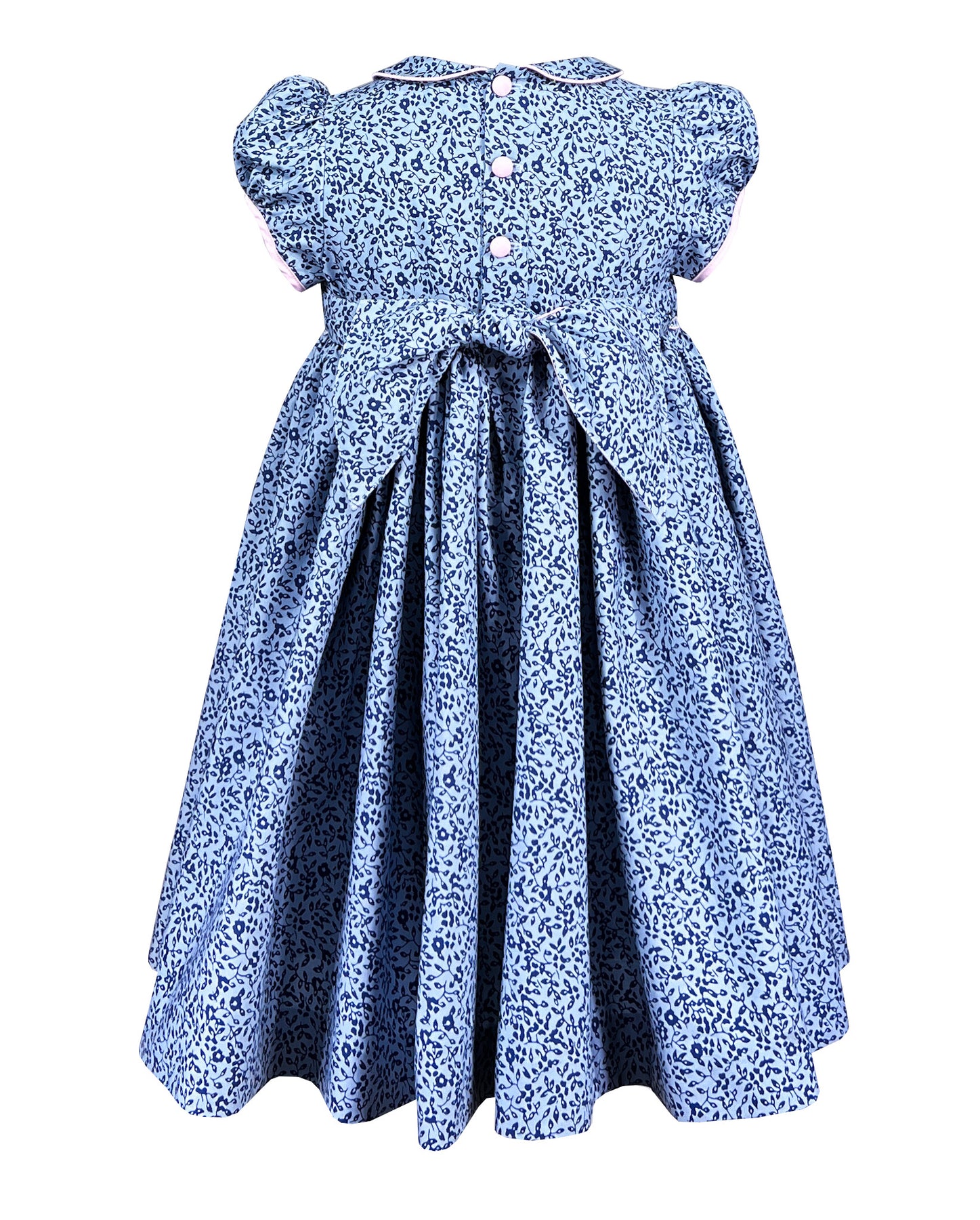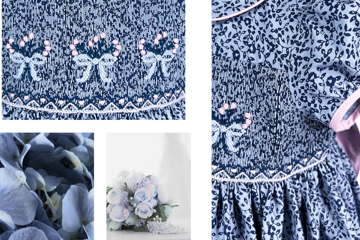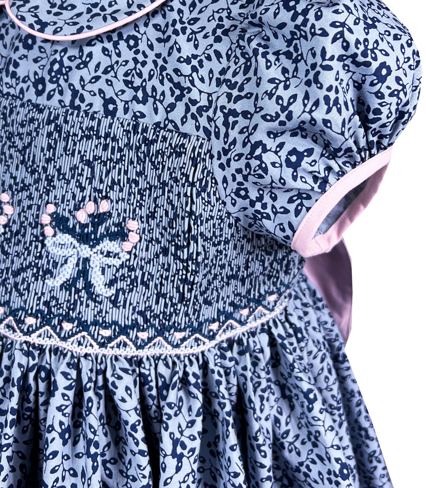A celebration of delicate femininity, this enchanting dress combines intricate smocking with a charming floral print. The fabric features a mesmerizing pattern of navy botanical motifs against soft sky blue, where tiny leaves and blooms dance across the surface in graceful profusion.