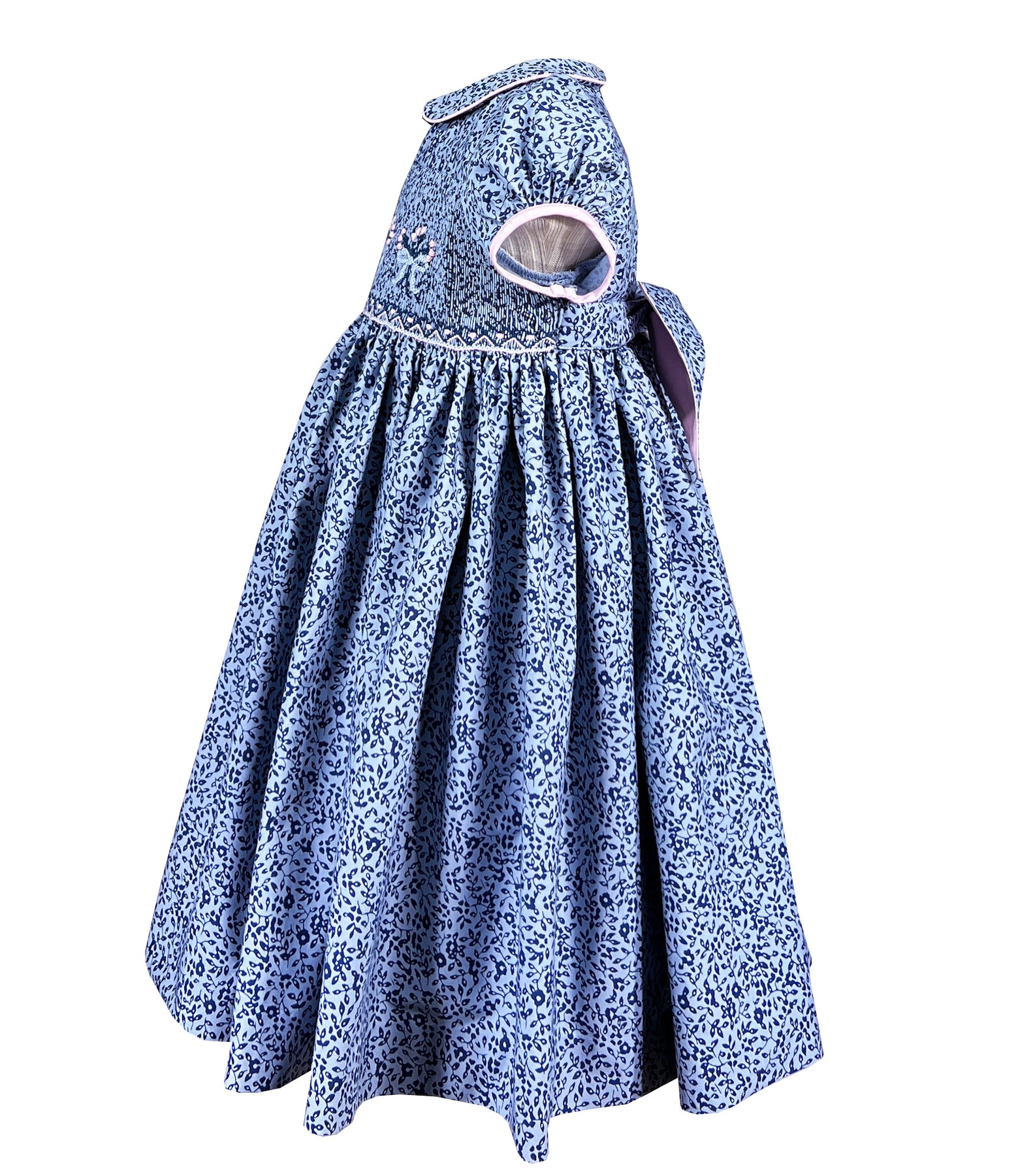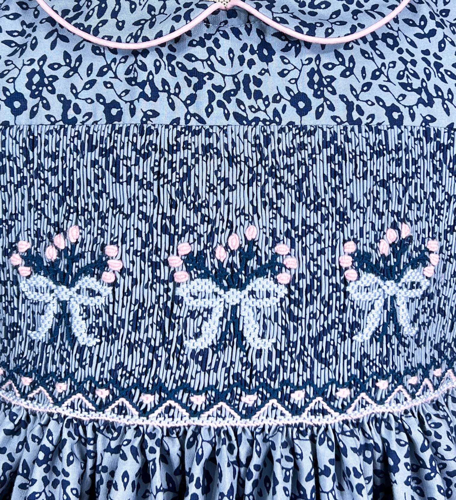 The bodice showcases our iconic hand smocking and tells a visual story in threads. Against the tight pleats, pastel blue ribbon bows emerge in perfect symmetry. Small pink bullion roses float above the bows like confetti, adding touches of tender color.
