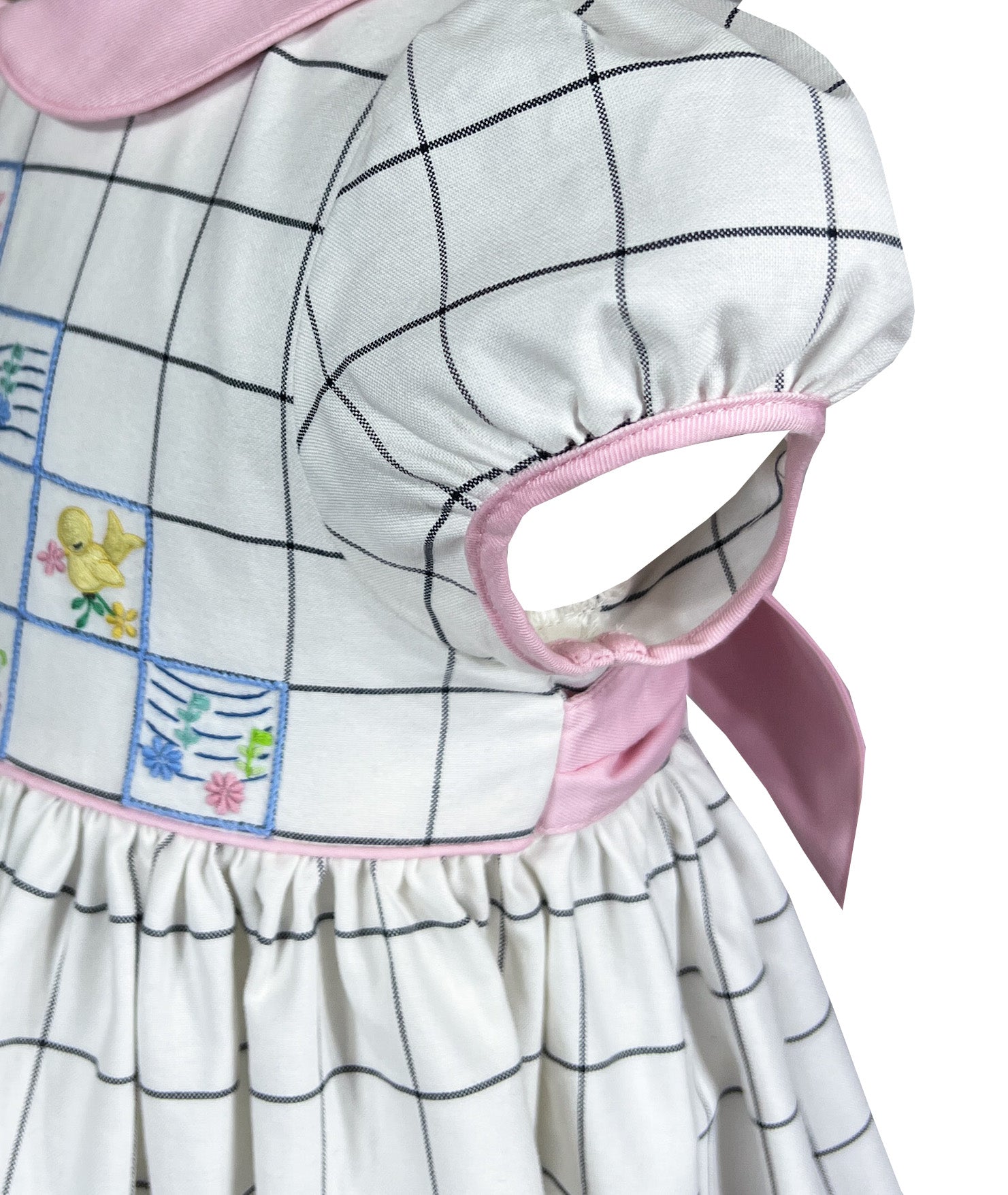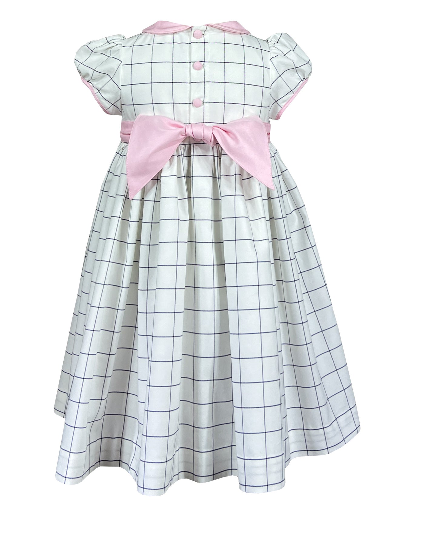 The classic pink Peter Pan collar adds a sweet finishing touch, complemented by matching self covered buttons, as well as trim along the puffed sleeves and waist. The gathered skirt maintains the same sophisticated windowpane pattern, creating fluid movement with every step. A generous sash ties at the back in a luxurious bow.
