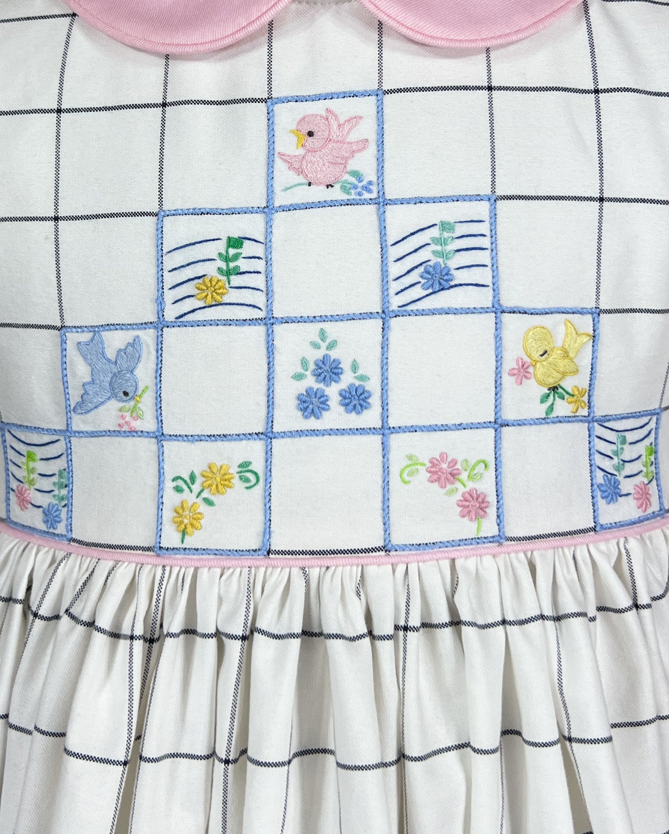 This enchanting dress features delicate hand embroidery depicting cheerful birds and blooming florals arranged in charming windowpane squares. The white base showcases an elegant grey check, while each embroidered vignette framed by sky blue stitching tells its own story: a pink cockatoo perched among blossoms, blue birds carrying branches, sweet yellow sunshine songbirds, and an array of pink and blue wildflowers shaped like music notes dancing across the bodice. Made by hand using traditional embroidery hoops and stitchings, each one a miniature work of art.