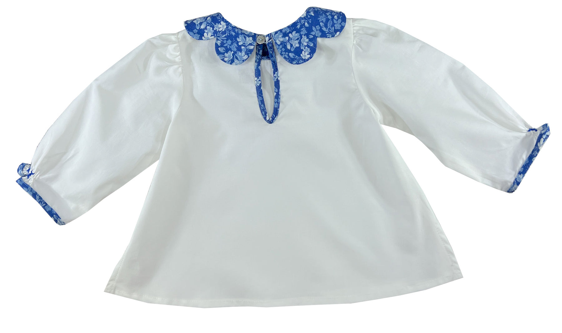 Le col en forme de pétale encadre le cou des petits avec poésie, tandis que la bordure assortie sur le bord des manches longues apporte une élégance raffinée jusque dans les moindres détails. La blouse se ferme dans le dos à l'aide de boutons plats en nacre pour faciliter l'habillage.