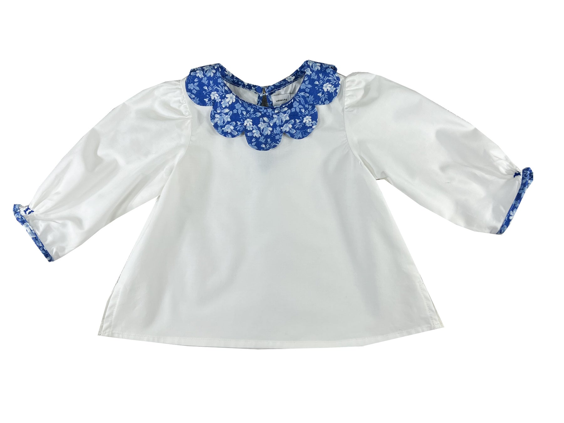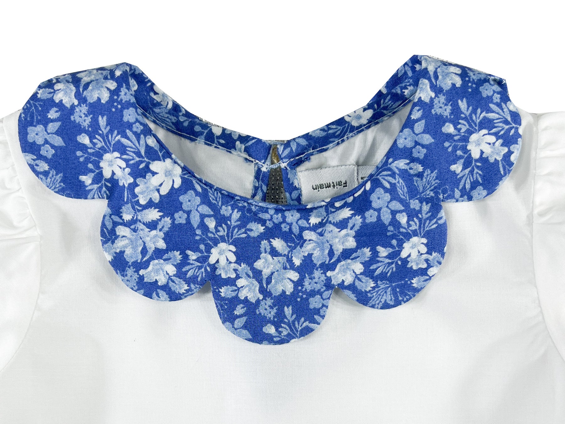 Ce petit haut apporte une touche d'élégance botanique à la garde-robe de bébé grâce à sa silhouette féminine. Le corps est confectionné dans un blanc éclatant, tandis que le col festonné distinctif présente un imprimé végétal délicat avec des feuilles blanches et bleues sur un fond bleu profond.