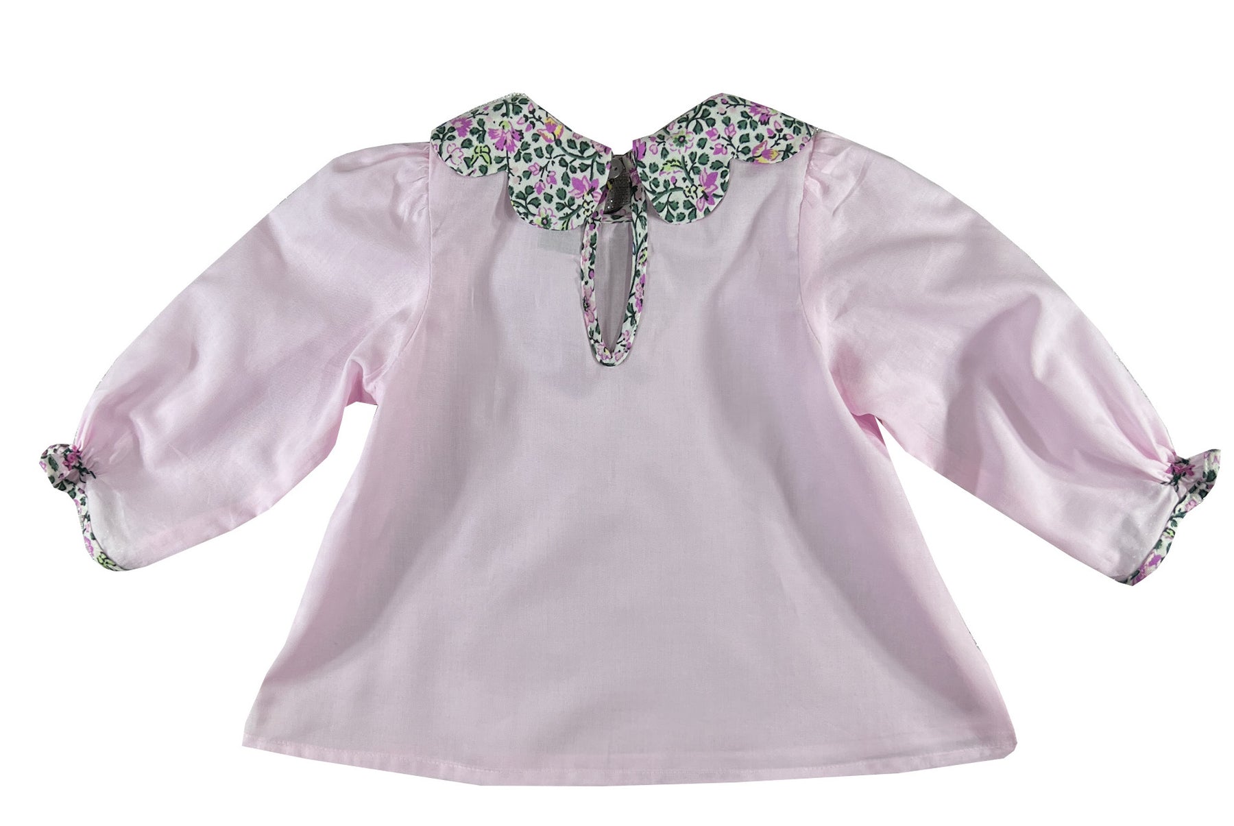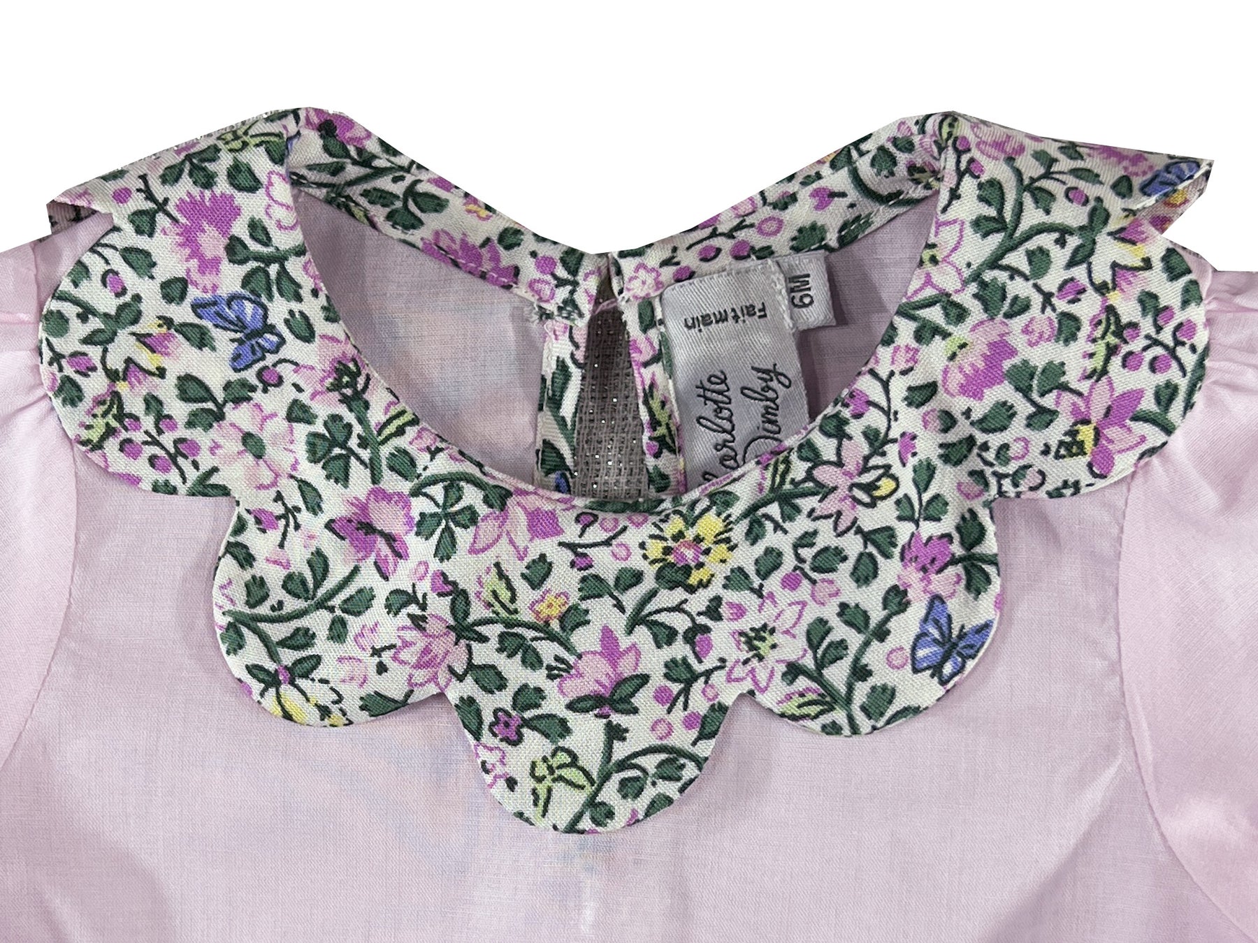 Ce haut pour bébé fille capture la joie d'un jardin en pleine floraison. Le corps est confectionné dans un rose tendre, tandis que le col festonné distinctif présente un ravissant imprimé sur fond blanc mettant en valeur des feuilles vertes, des fleurs roses et jaunes et de charmants papillons bleus.
