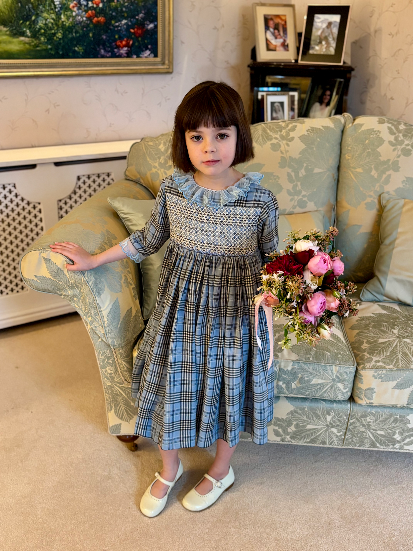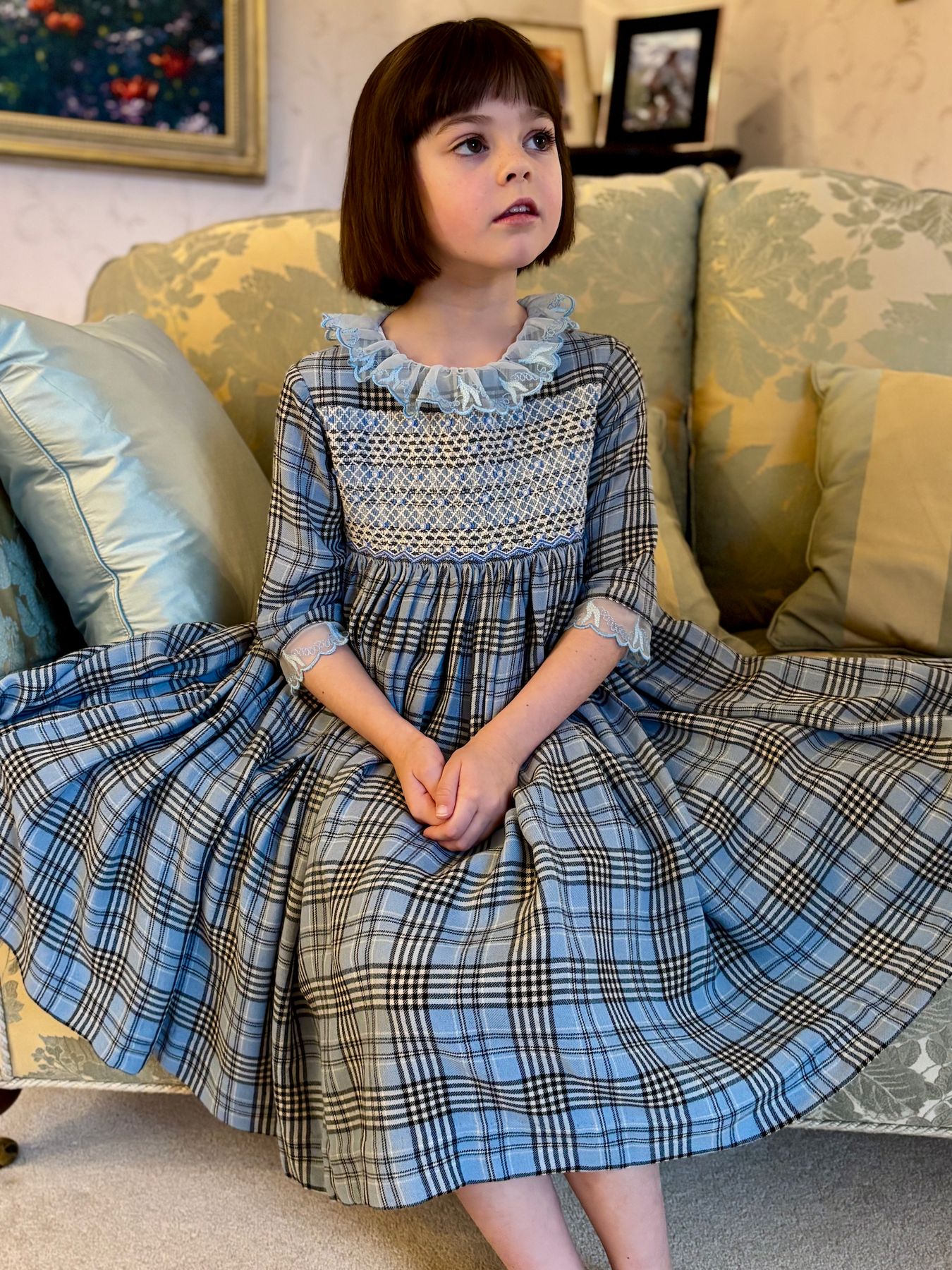 Une célébration de contrastes, cette robe captivante unit deux traditions textiles apparemment disparates en une poésie harmonieuse. Le tartan bleu ciel et noir apporte force et patrimoine, son plaid audacieux évoquant les vallons écossais et les paysages de landes. Contre cette toile de fond structurée, des détails délicats émergent comme des fleurs sauvages poussant à travers un terrain rocheux : un col éthéré à volants en dentelle avec des bords festonnés, des smocks complexes ornés de boutons de rose bleus, et d'élégantes manches trois-quarts finies avec des poignets en dentelle assortis.