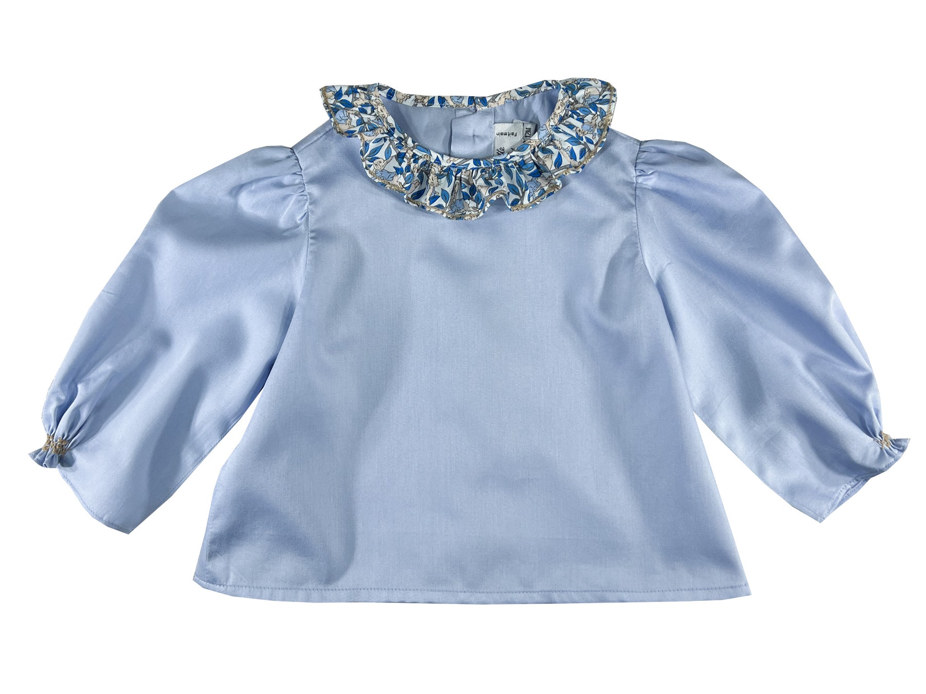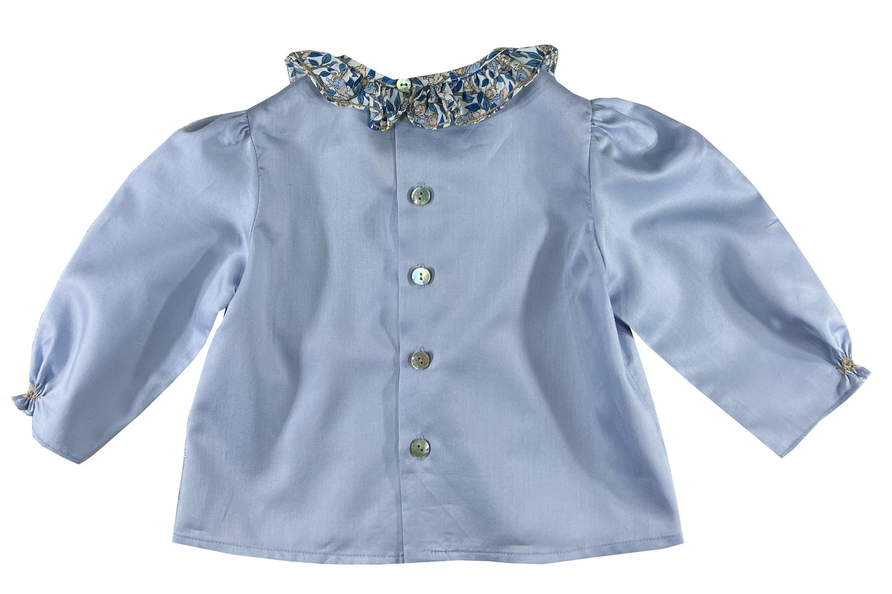 La blouse se ferme dans le dos à l'aide de boutons plats en nacre, alliant élégance et facilité. C'est le cadeau idéal pour un nouveau-né ou un bébé. Elle peut être portée avec une salopette, une culotte bouffante, une jupe ou sous un pull.