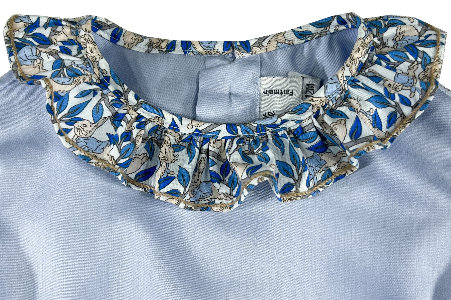 Cette blouse pour bébé fille capture l'univers enchanteur de Beatrix Potter dans un imprimé Liberty raffiné. Le corps est confectionné dans un bleu pervenche doux, tandis que le col arbore un motif charmant représentant des lapins espiègles vêtus de vestes bleu pâle, nichés parmi un feuillage bleu. L'imprimé donne vie à ces moments tirés des contes où les lapins explorent des jardins secrets.