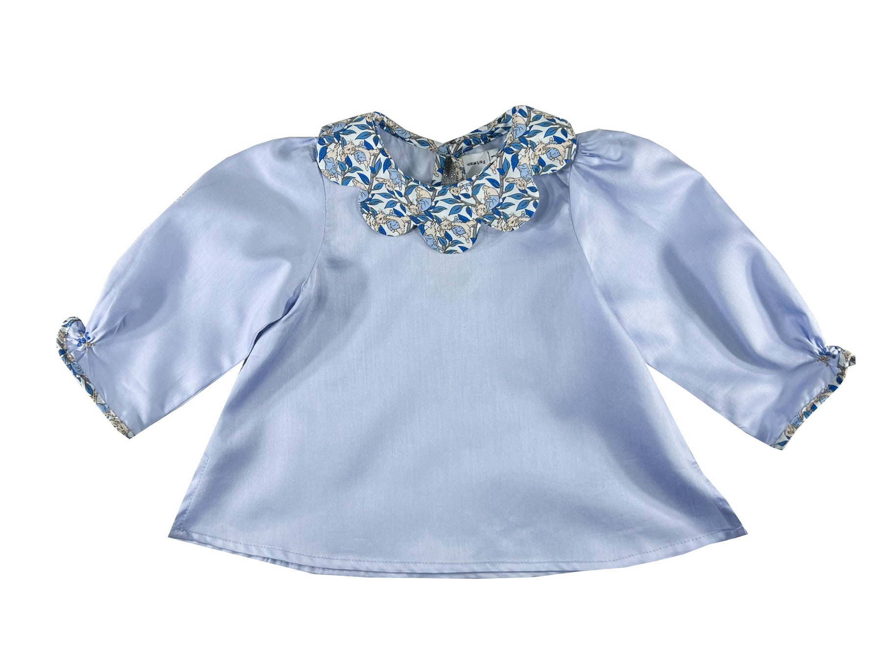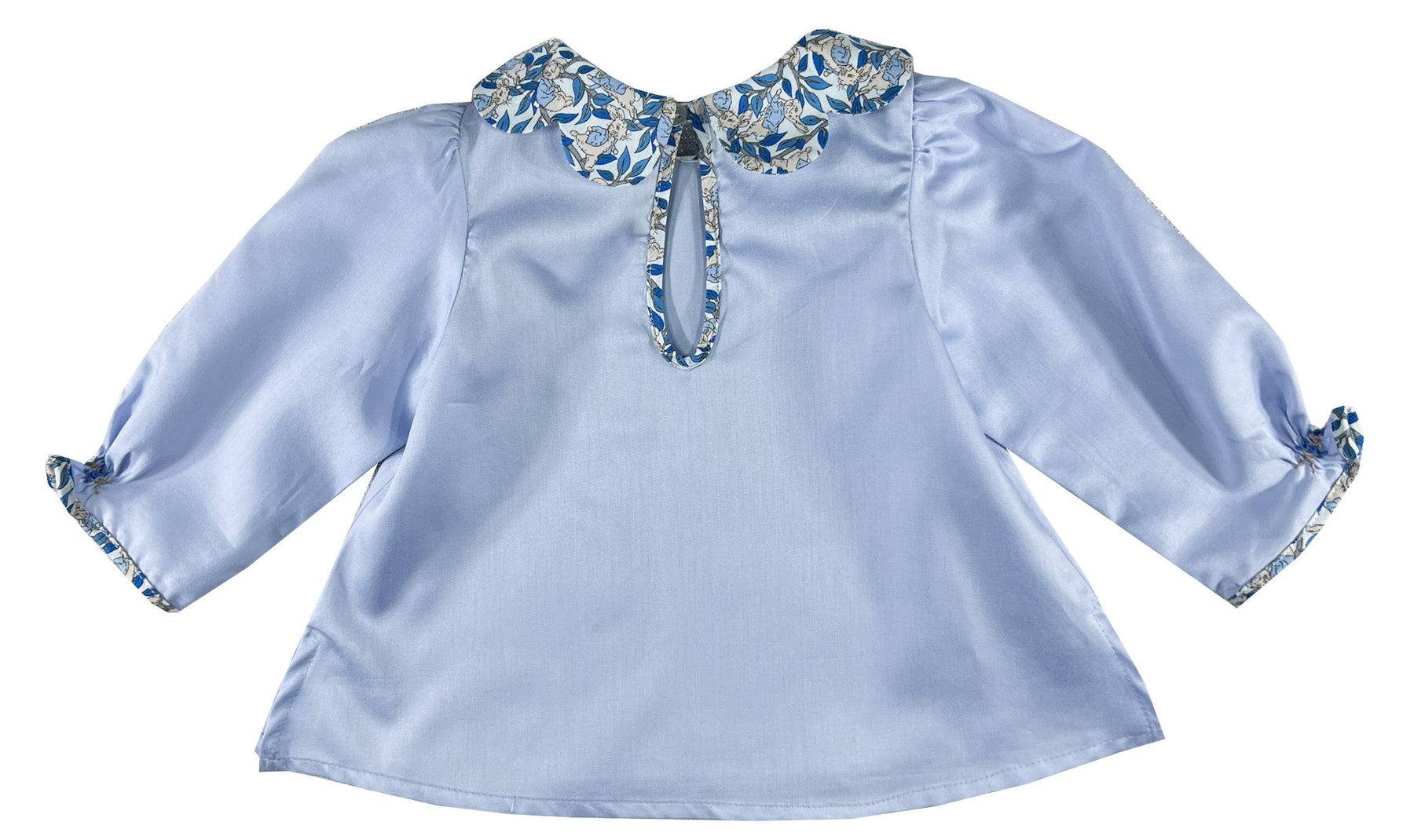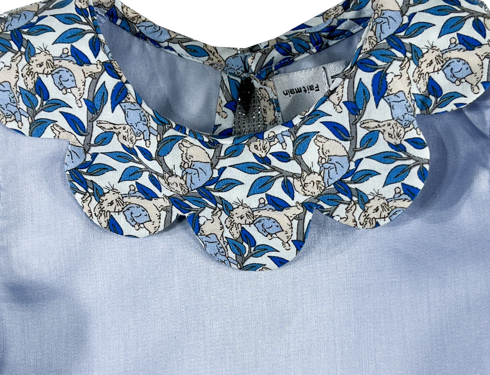 Le corps est confectionné dans un bleu pervenche doux, tandis que le col pétale et les manches longues passepoilées mettent en valeur l'imprimé Liberty sur fond blanc, représentant de doux lapins beiges vêtus de vestes bleu pâle nichés parmi un délicat feuillage bleu.