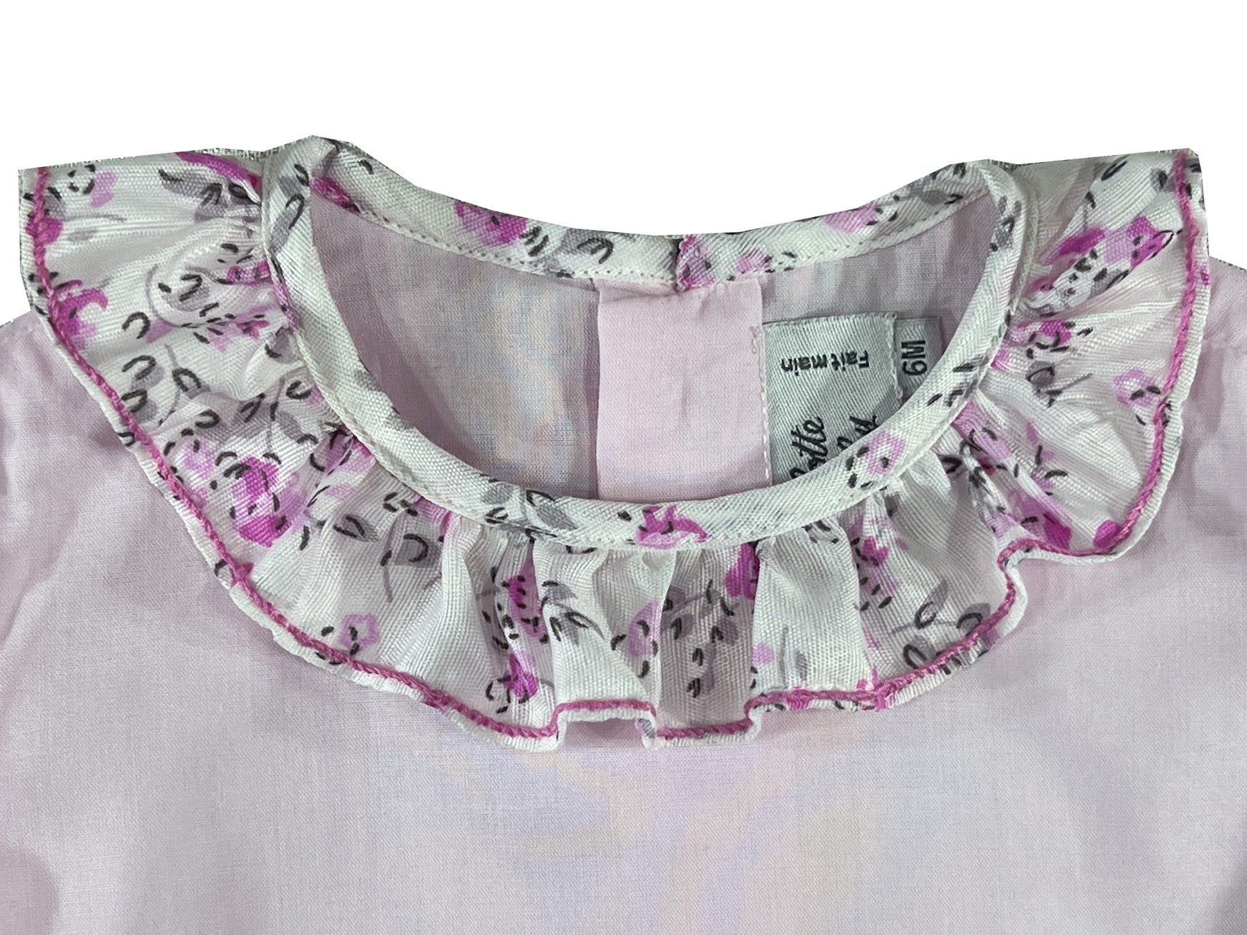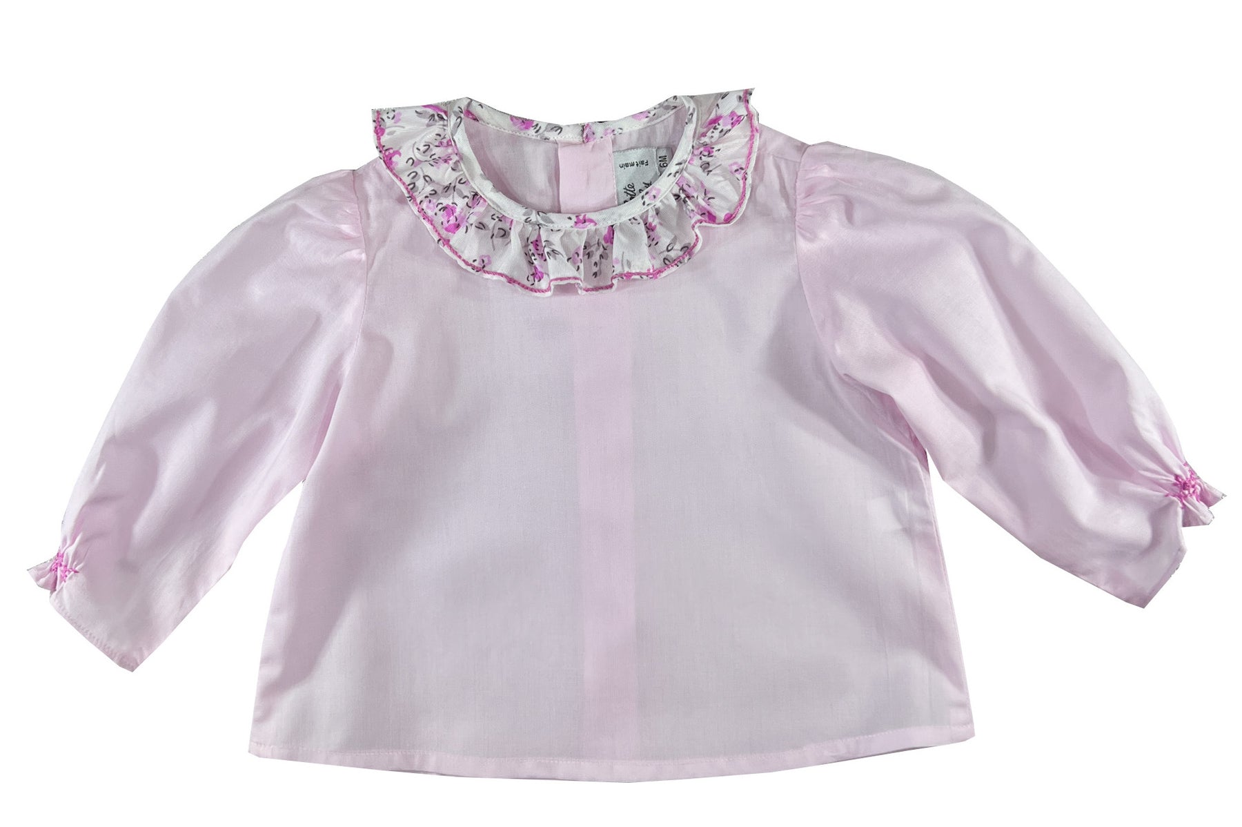 Cette jolie blouse capture le romantisme d'un jardin en pleine floraison. Le corps est confectionné dans un rose tendre, tandis que le col à volants arbore un délicat imprimé floral blanc rehaussé de fleurs rose pâle, fuchsia, violet et gris.
