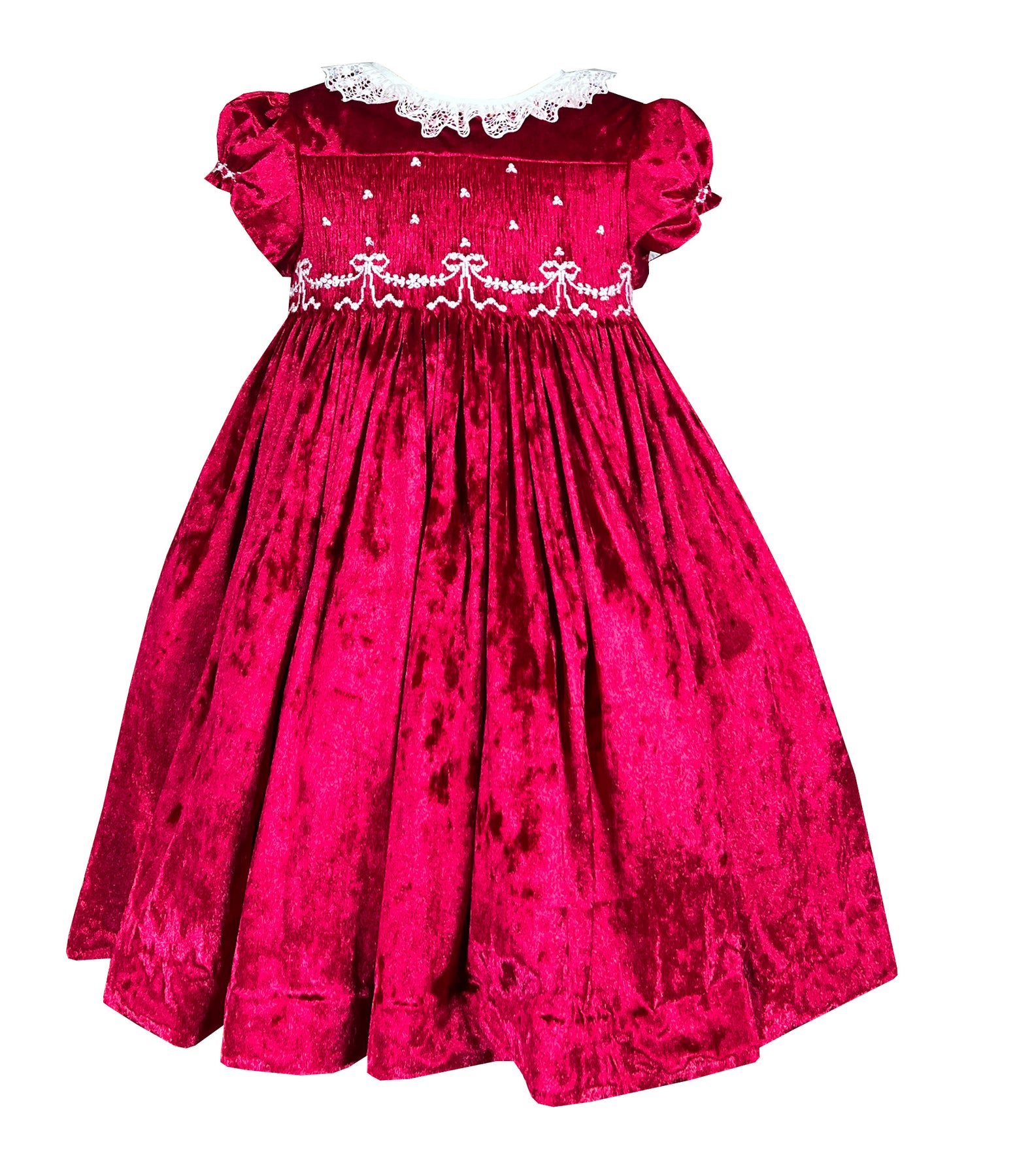 Cette ravissante robe de Noël incarne l'élégance intemporelle des boulevards parisiens pendant la période la plus magique de l'année. Confectionnée dans un somptueux velours rouge qui capte la lumière comme des rubis précieux, cette pièce présente un smocks raffiné orné de délicats nœuds blancs qui dansent sur le corsage comme des flocons de neige.