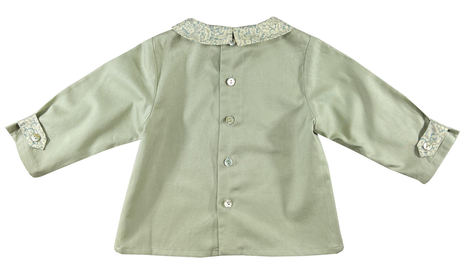 Cette chemise à manches longues pour bébé garçon apporte une élégance naturelle à la coupe classique. Alors que le corps est confectionné dans une belle teinte vert sauge, le col pointu impeccable et les longues pattes décoratives arborent un délicat imprimé feuillage qui ajoute une touche botanique à la silhouette raffinée.