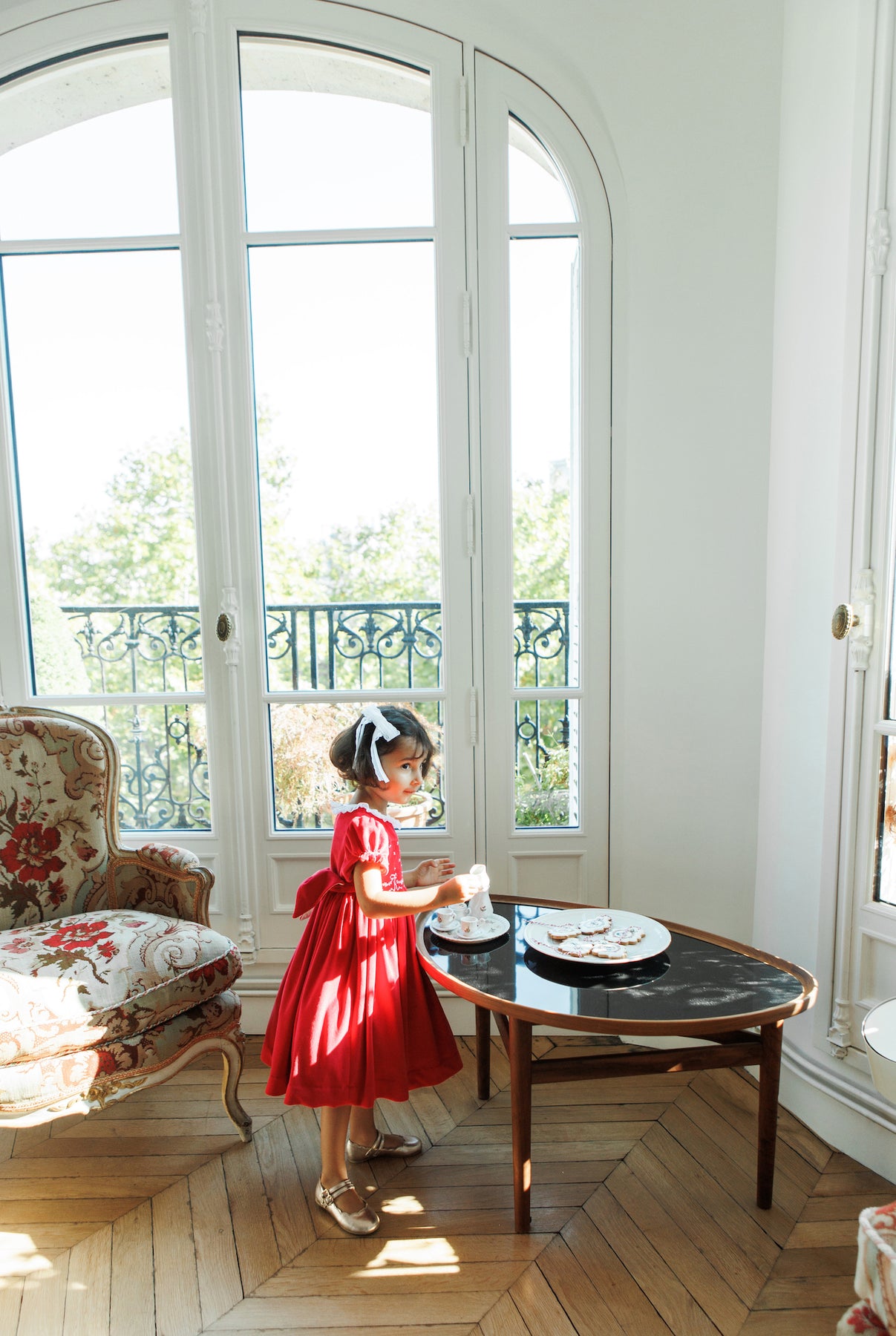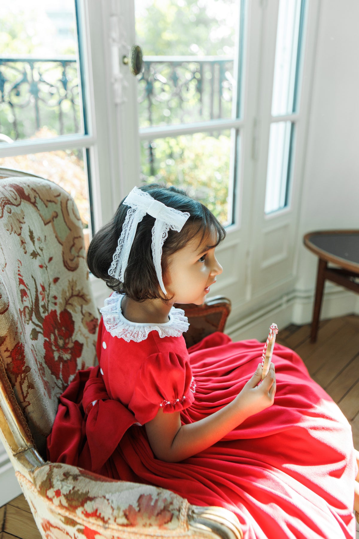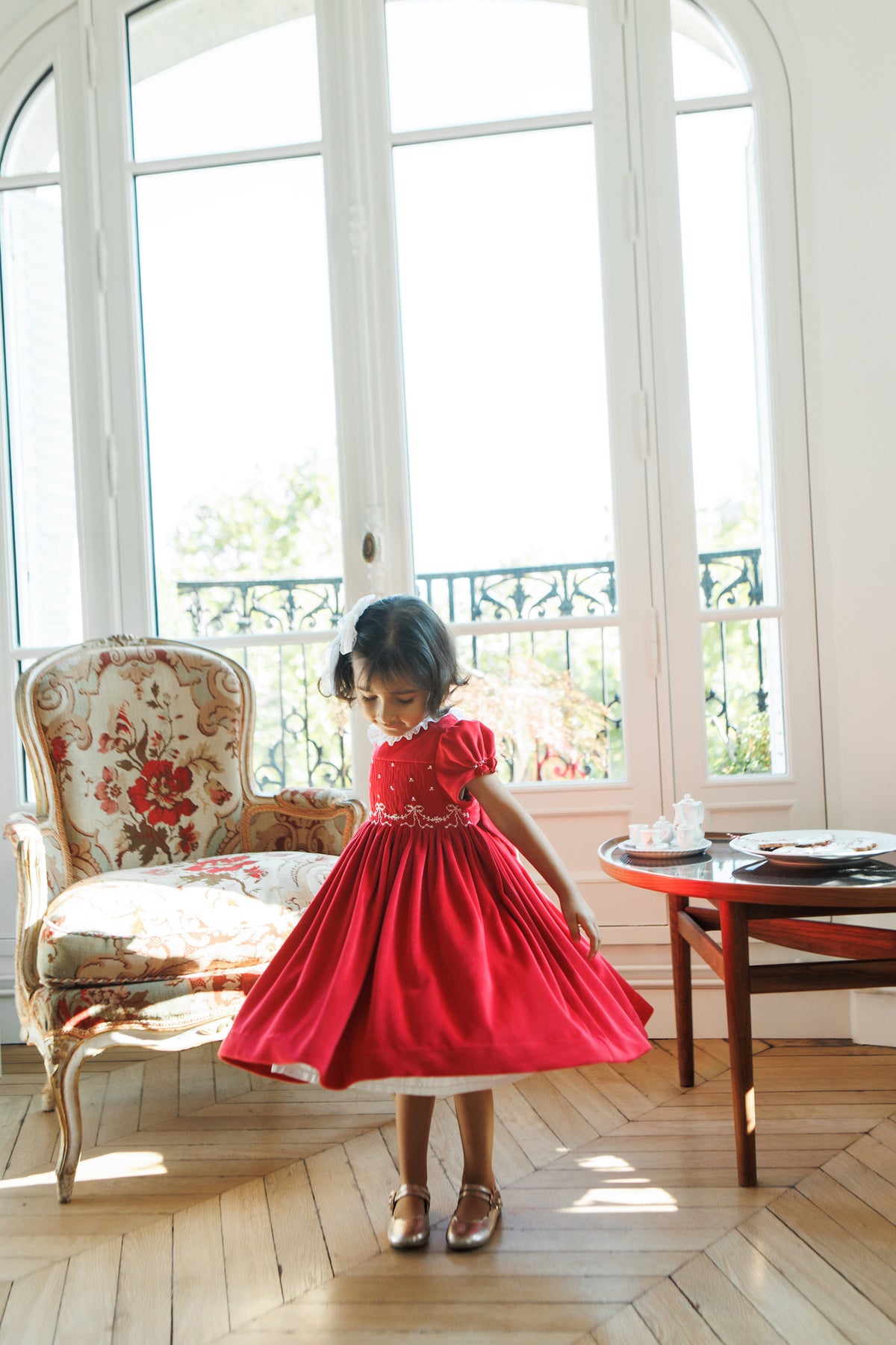 Cette ravissante robe de Noël incarne l'élégance intemporelle des boulevards parisiens pendant la période la plus magique de l'année. Confectionnée dans un somptueux velours rouge qui capte la lumière comme des rubis précieux, cette pièce présente un smocks raffiné orné de délicats nœuds blancs qui dansent sur le corsage comme des flocons de neige.