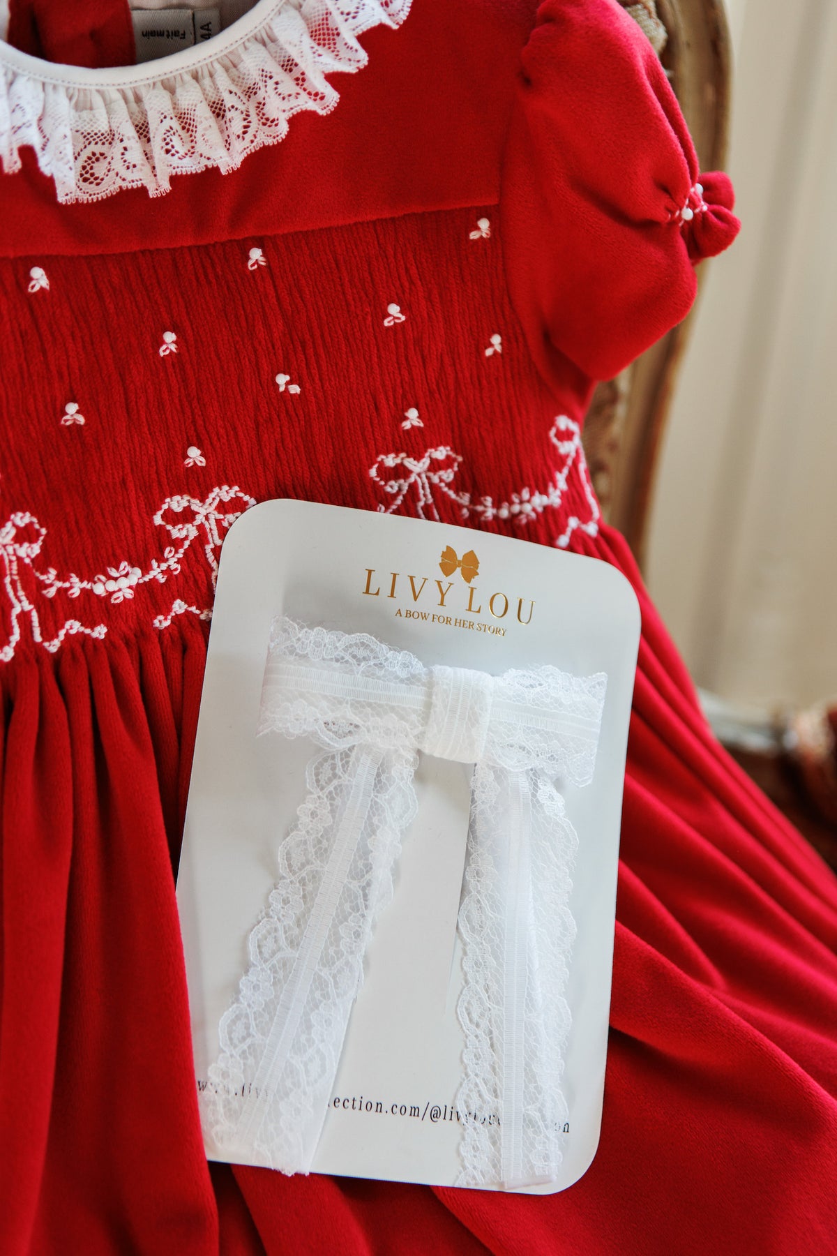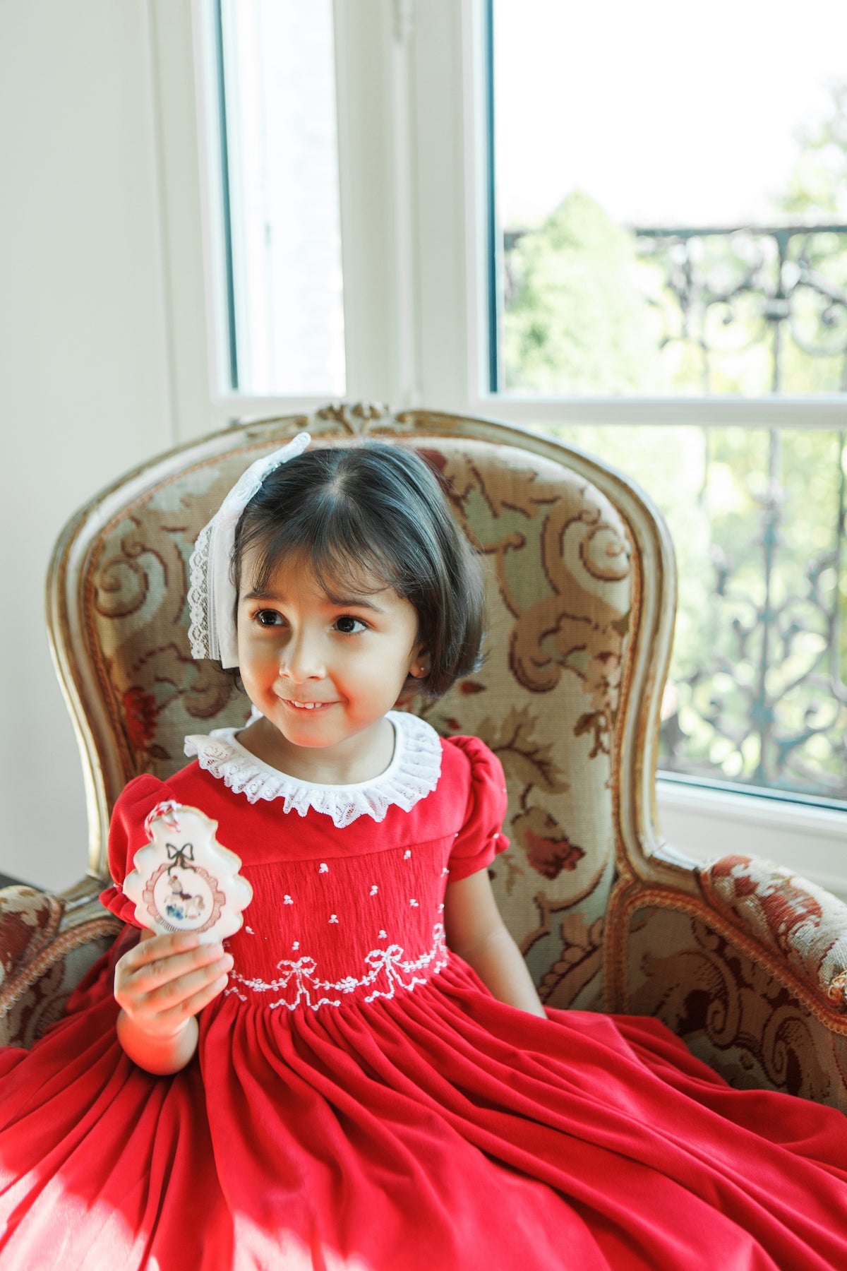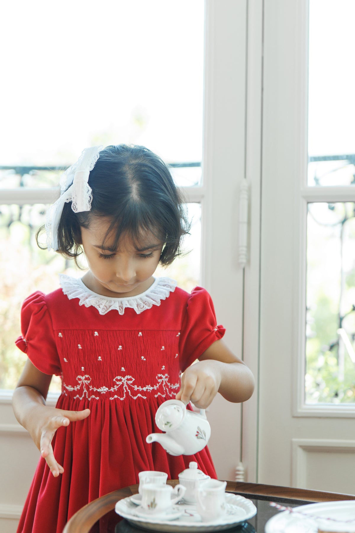 Cette ravissante robe de Noël incarne l'élégance intemporelle des boulevards parisiens pendant la période la plus magique de l'année. Confectionnée dans un somptueux velours rouge qui capte la lumière comme des rubis précieux, cette pièce présente un smocks raffiné orné de délicats nœuds blancs qui dansent sur le corsage comme des flocons de neige.