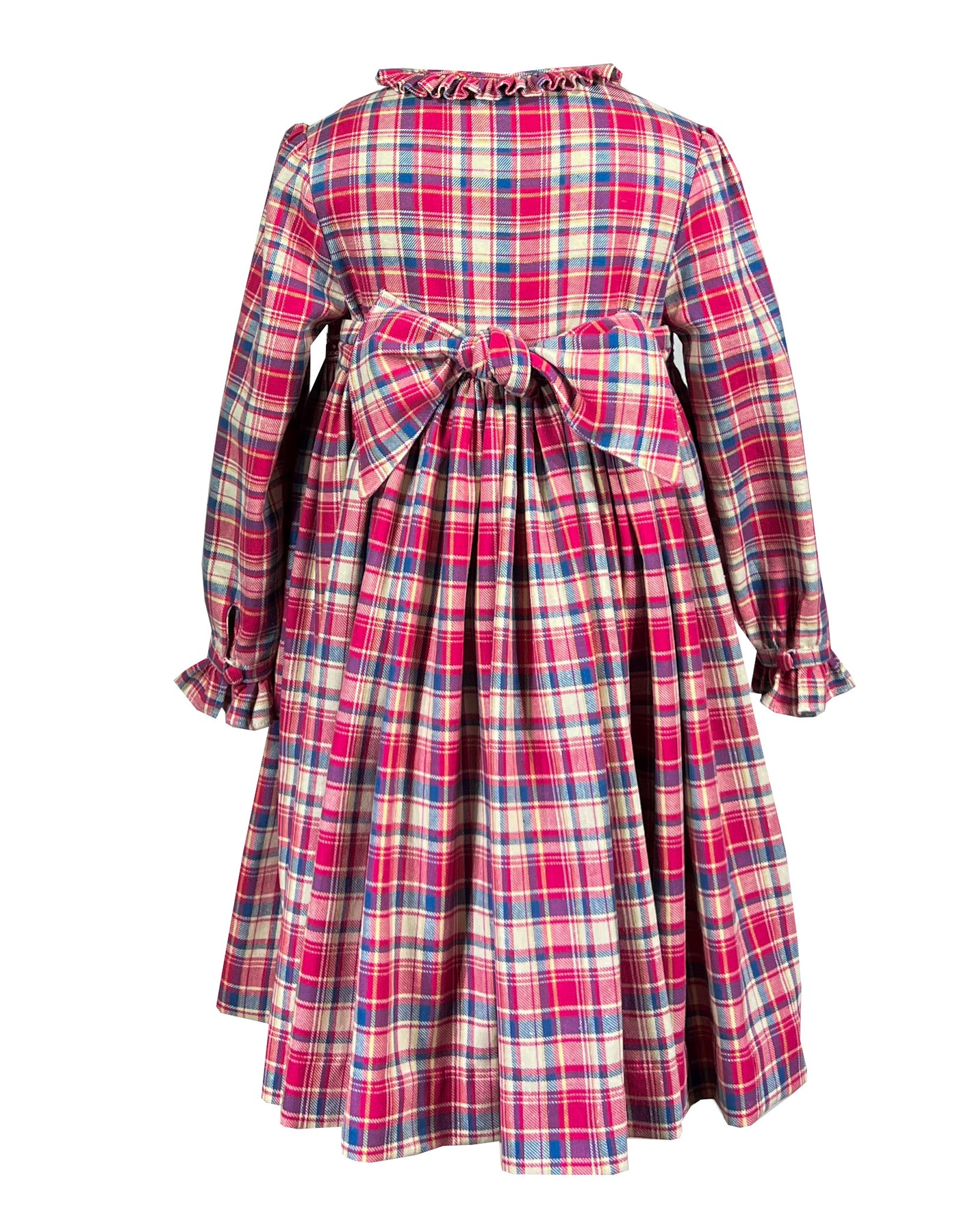 Cette charmante robe évoque l'atmosphère accueillante d'un chalet alpin, avec un tartan audacieux associé à des smocks géométriques détaillés qui célèbrent les traditions montagnardes. Le tartan vif associe rose framboise, bleu marine profond et crème douce dans un motif qui rayonne de luminosité tout au long des mois froids.