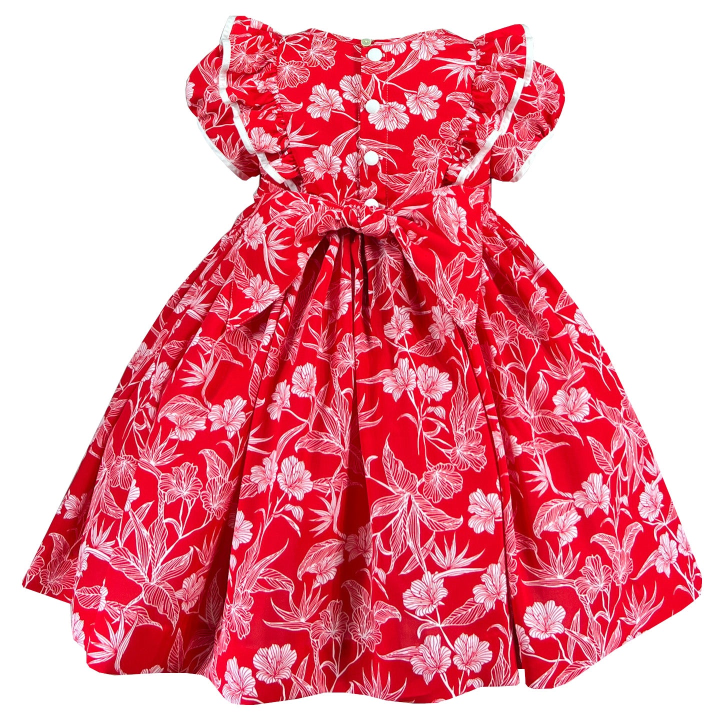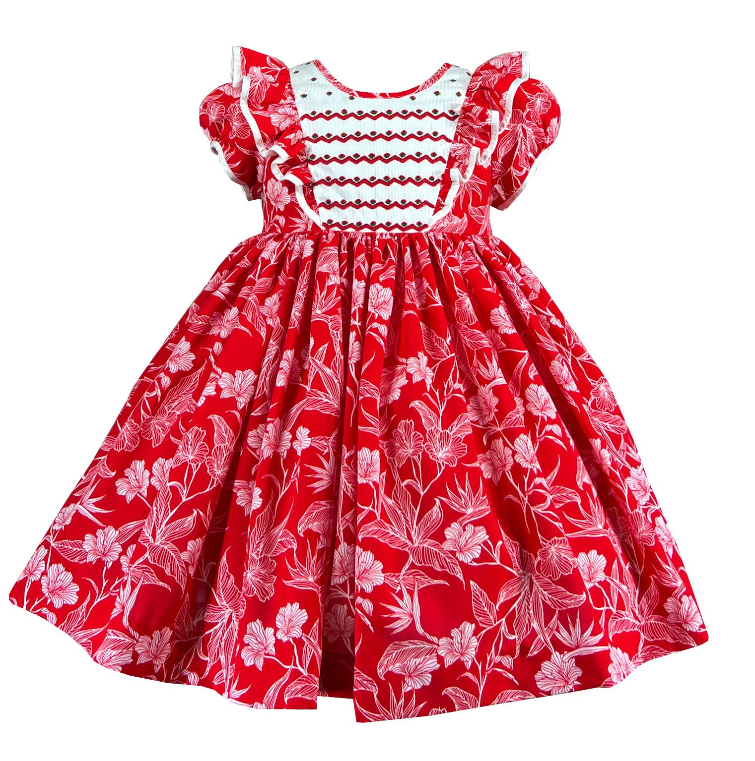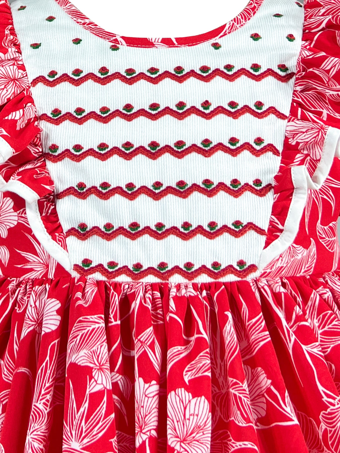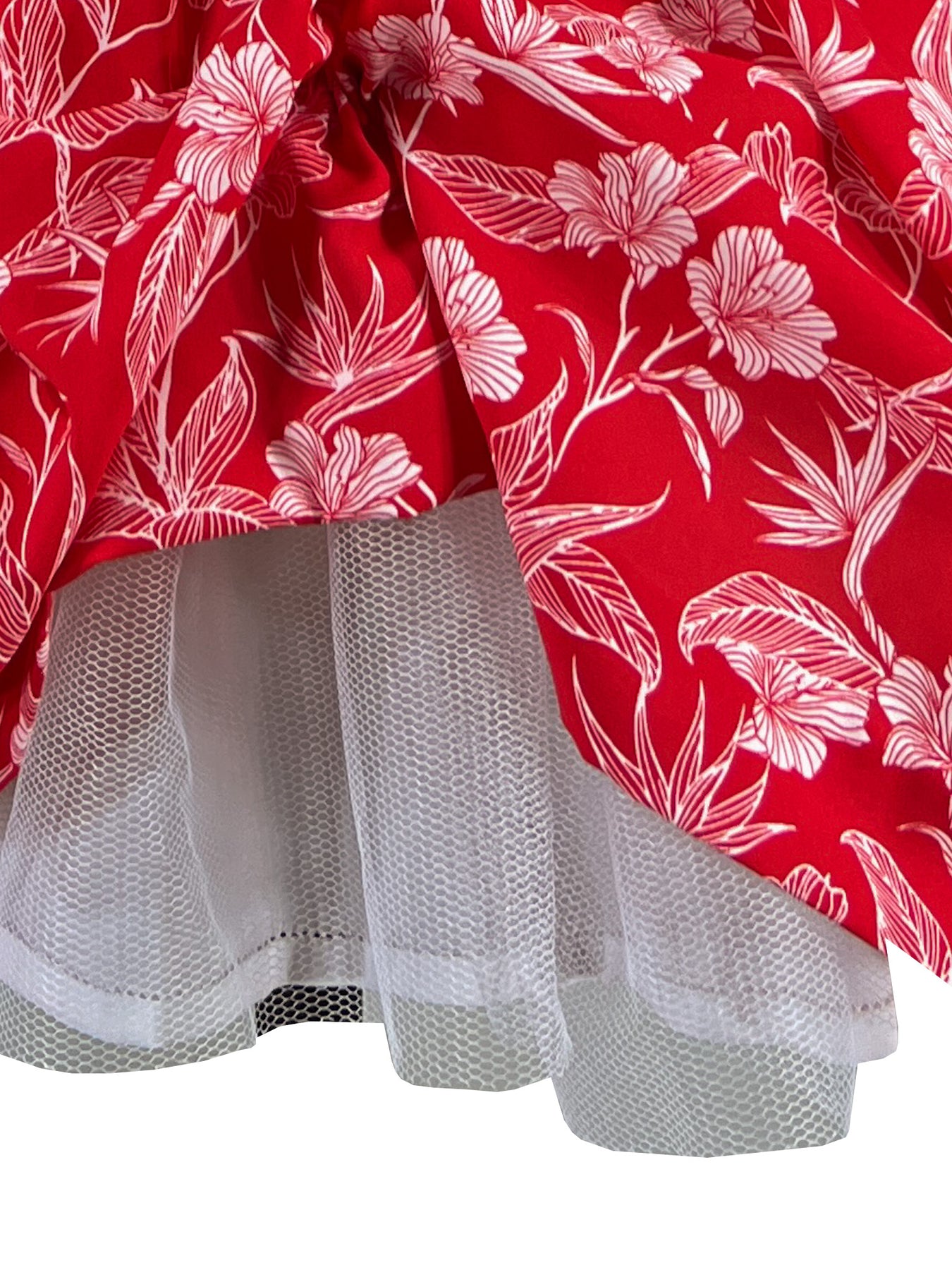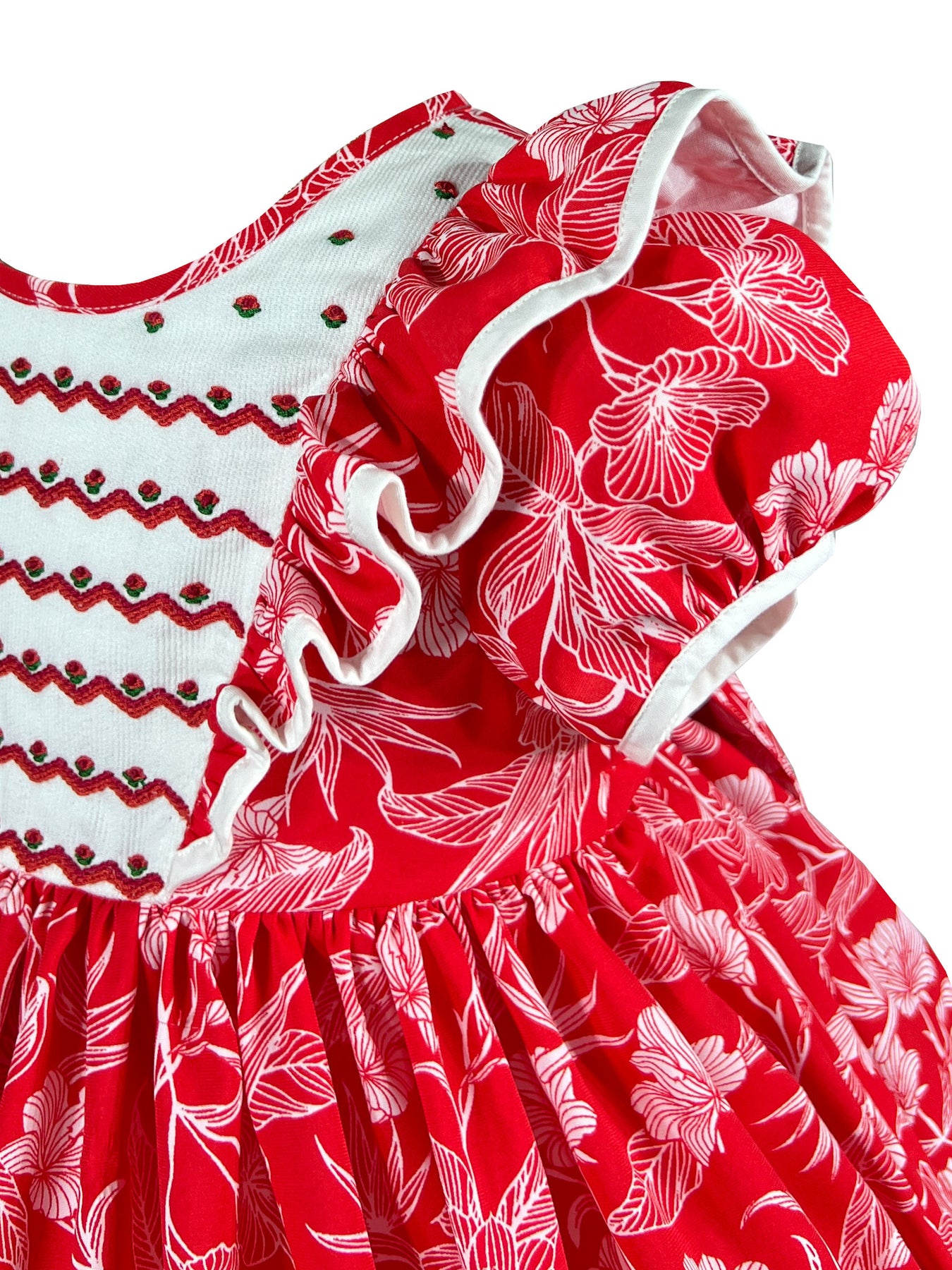 Des volants descendent le long de la poitrine et des épaules, créant un effet de mouvement. Les manches ballons sont finies d'un biais blanc, tandis que le corsage blanc présente des rangées de zig zag rouge avec de délicats boutons floraux et des feuilles vertes. La jupe est sublimée par une doublure en tulle supplémentaire pour plus de volume. Des boutons blancs recouverts et une ceinture nœud papillon coordonnée complètent la création. Cette robe attirera à coup sûr l'attention par son utilisation audacieuse de la couleur et son exubérance botanique.