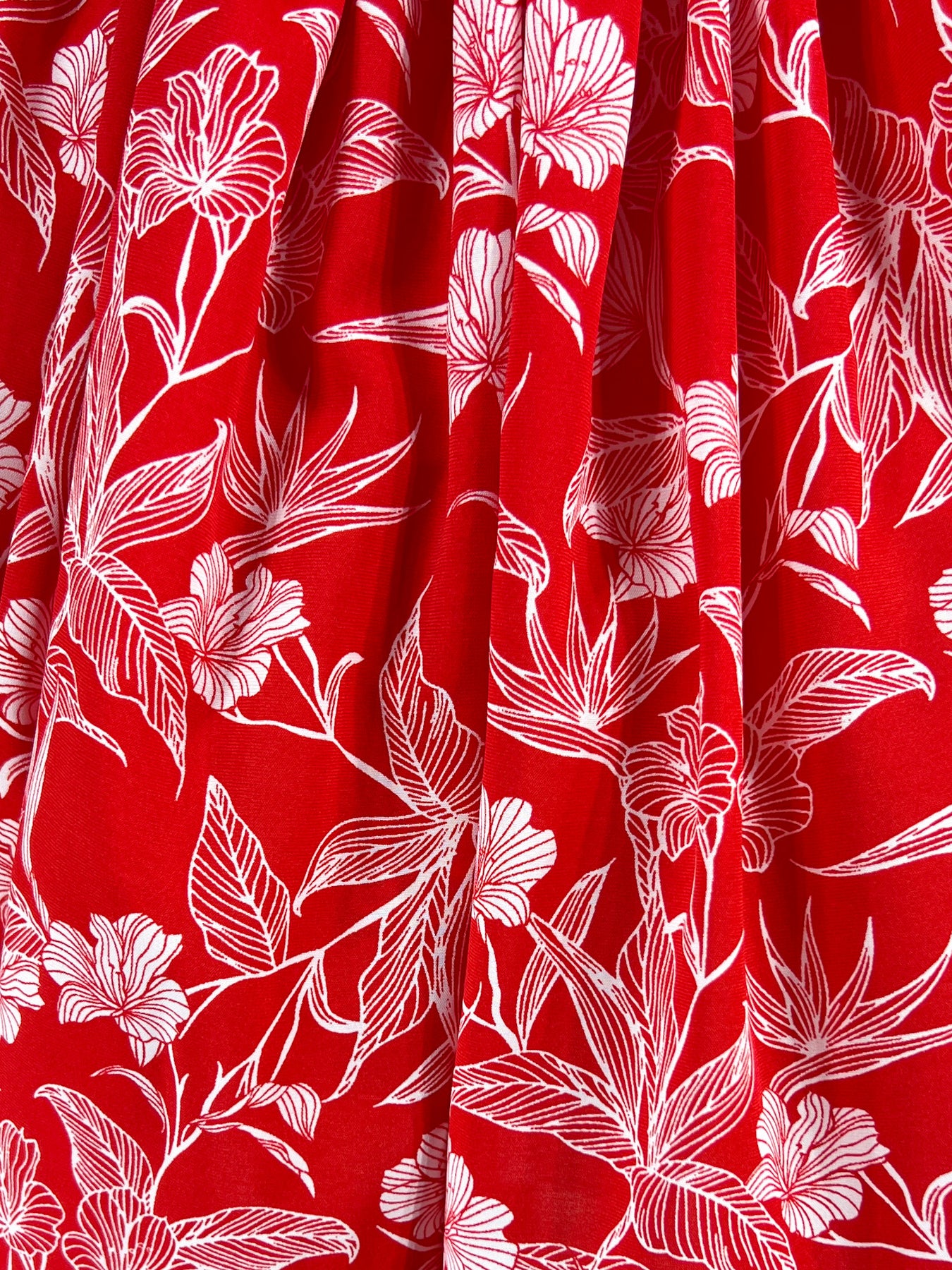 Audacieuse et exubérante, cette robe Netti est un passeport pour les rivages tropicaux. Confectionnée dans un tissu ultra léger, doux et souple, elle présente un fond rouge corail vif animé de fleurs tropicales graphiques blanches et de tiges.