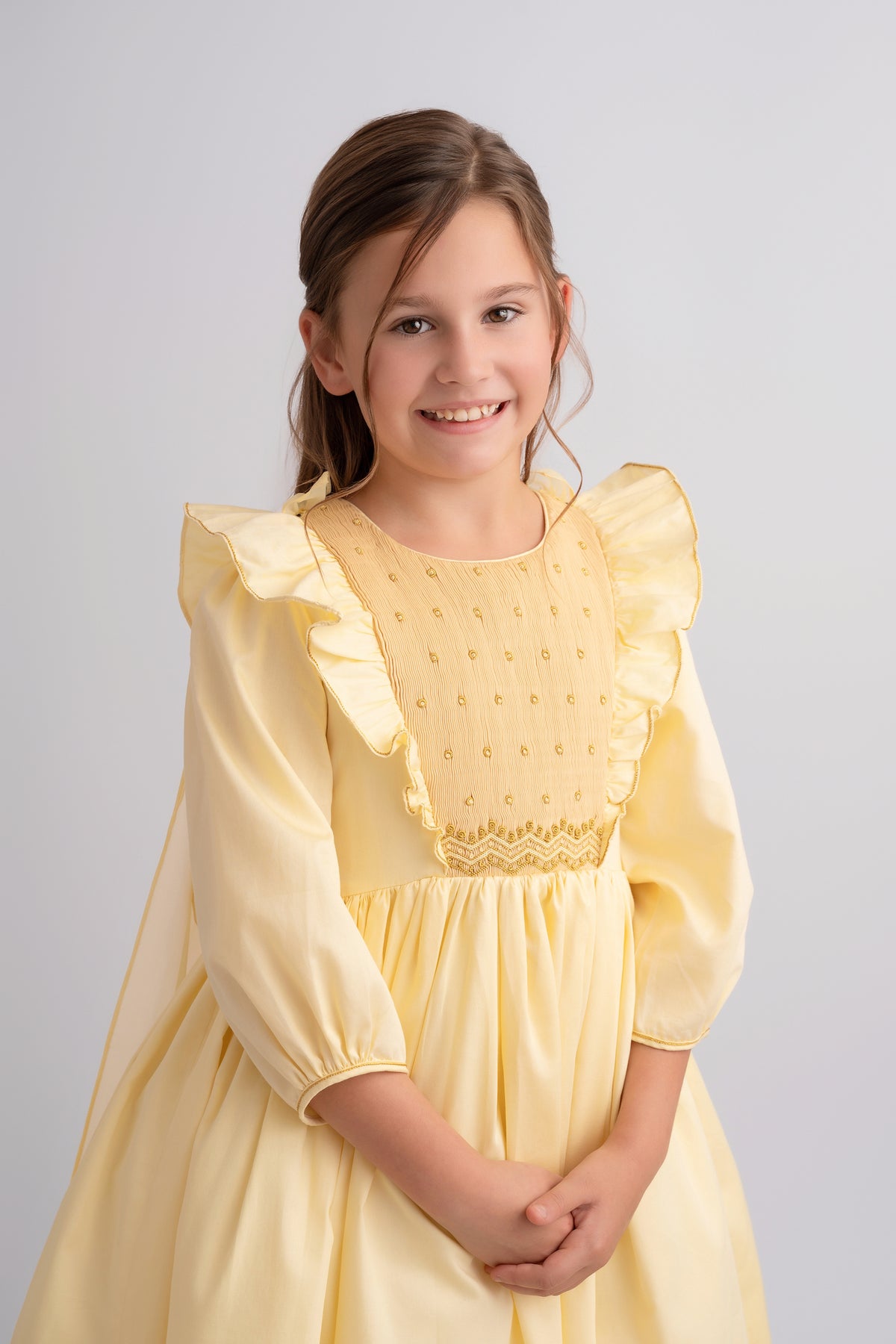 Le corsage smocké à la main met en valeur le meilleur de notre savoir-faire, où des fils dorés créent des motifs complexes semblables à des bijoux qui semblent scintiller de leur propre magie.