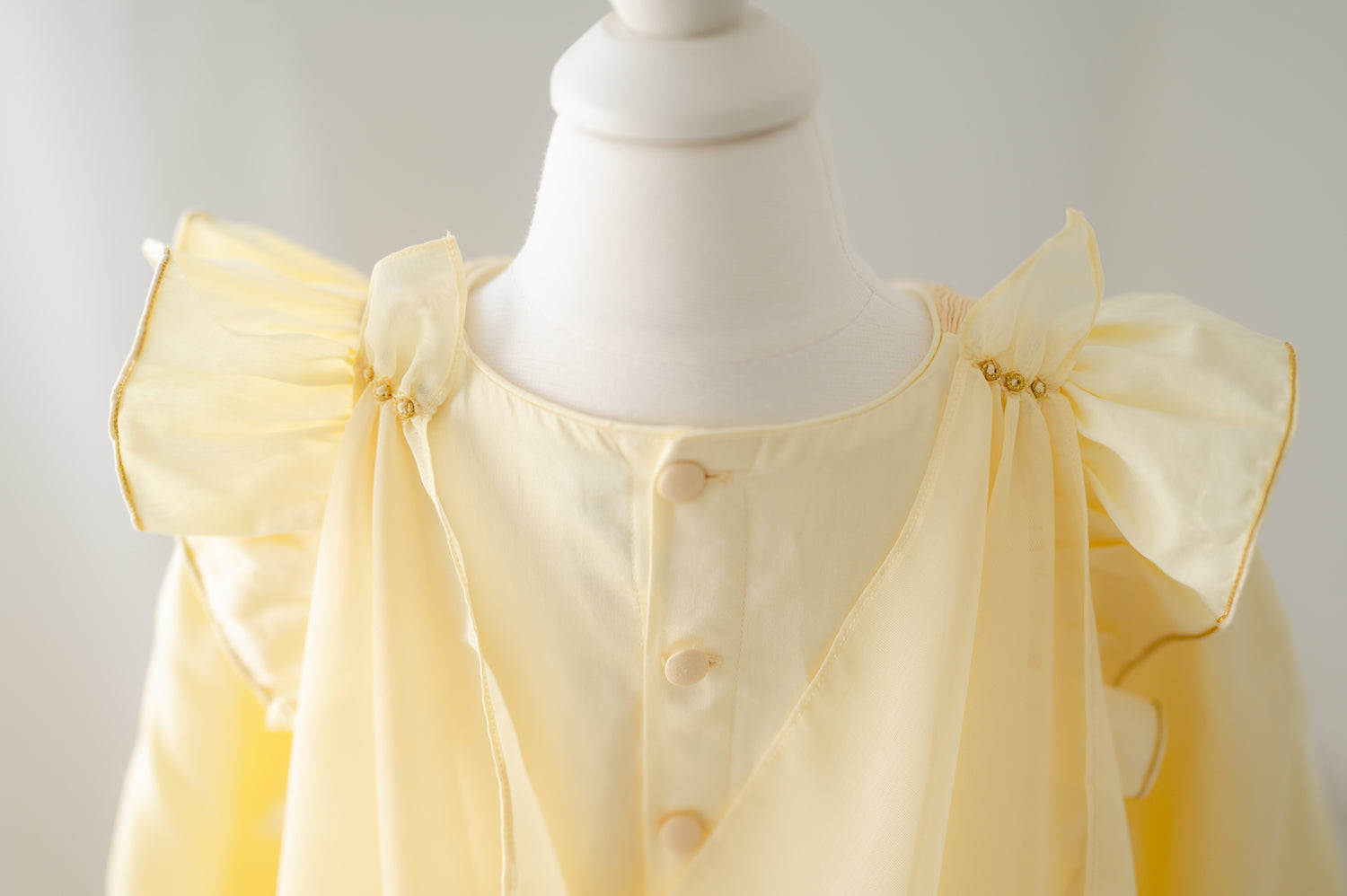Confectionnée avec amour dans un satin de coton jaune doré, cette robe capture l'essence même de la robe de bal emblématique de Belle. Le tissu luxueux capte la lumière à chaque mouvement, créant un éclat lumineux qui reflète les chandeliers dansants du conte de fées tant aimé. Le tissu haut de gamme garantit à la fois confort et élégance.