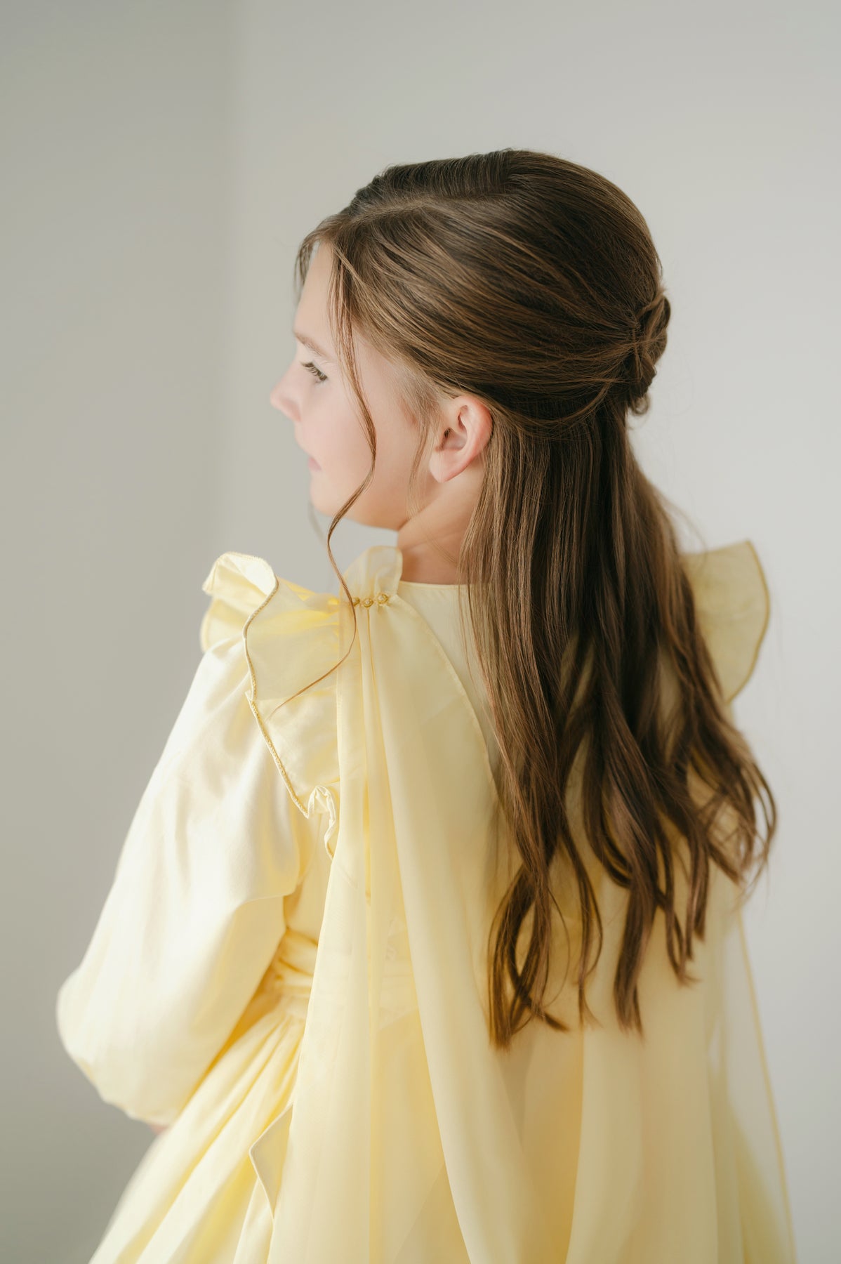 Les manches trois-quarts gracieuses et les volants qui tombent en cascade sur la poitrine et les épaules créent une silhouette de princesse parfaite, tandis que la cape en organza transparent ajoute une touche féérique digne du plus magnifique des bals de Noël.
