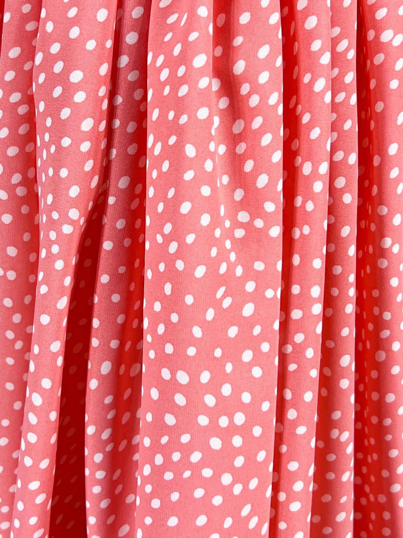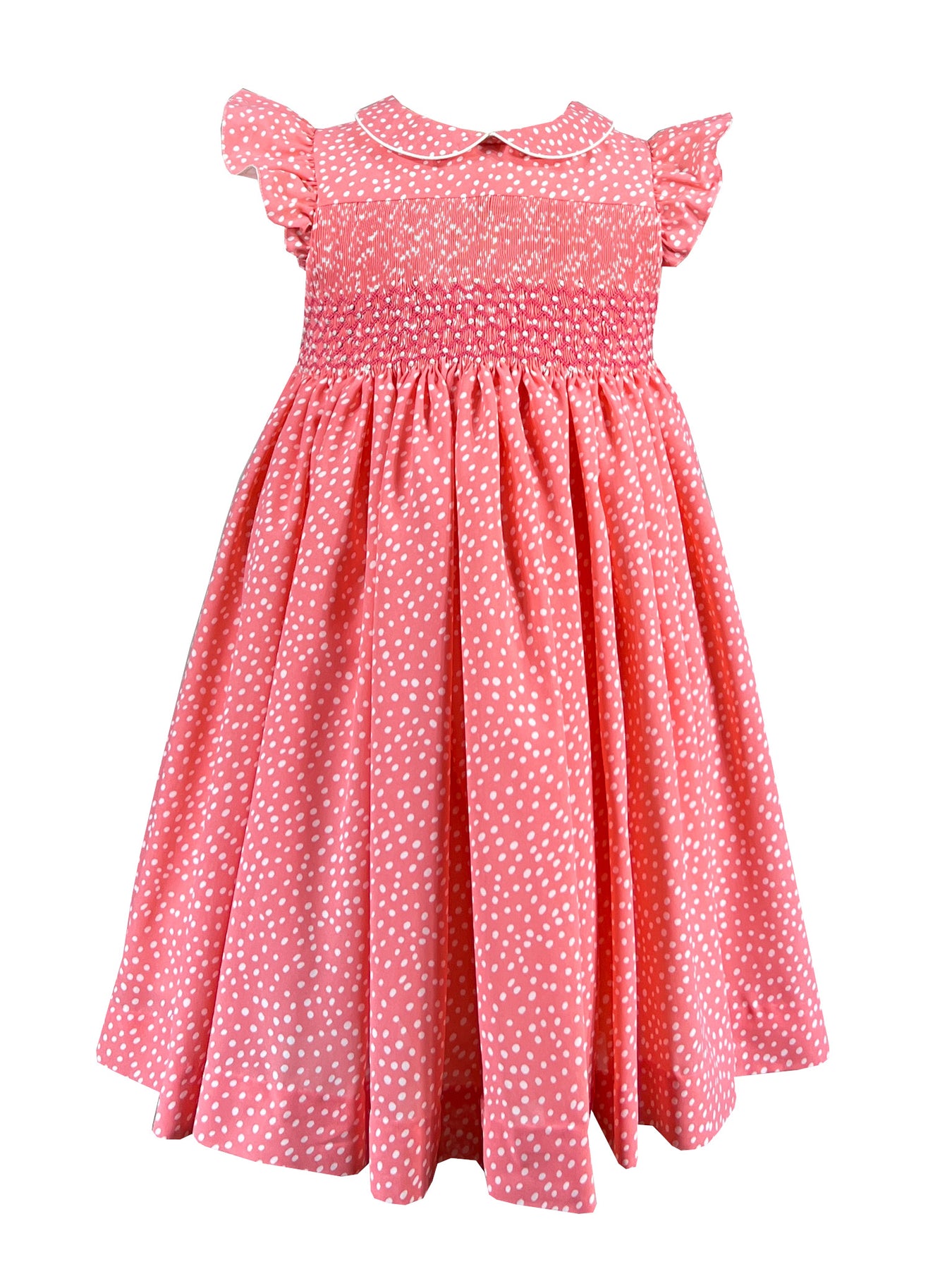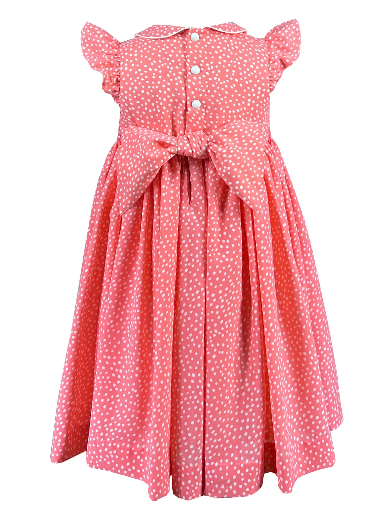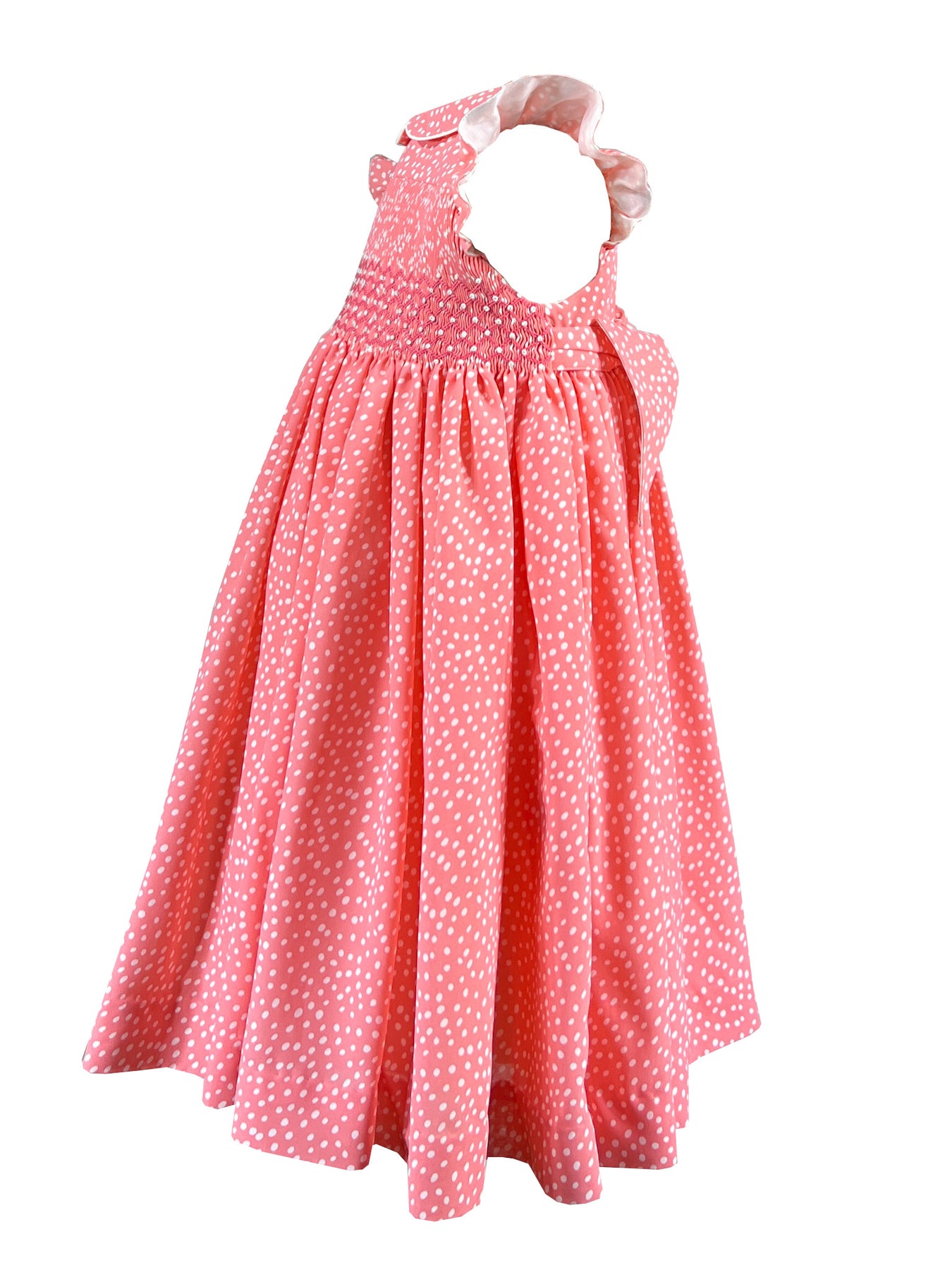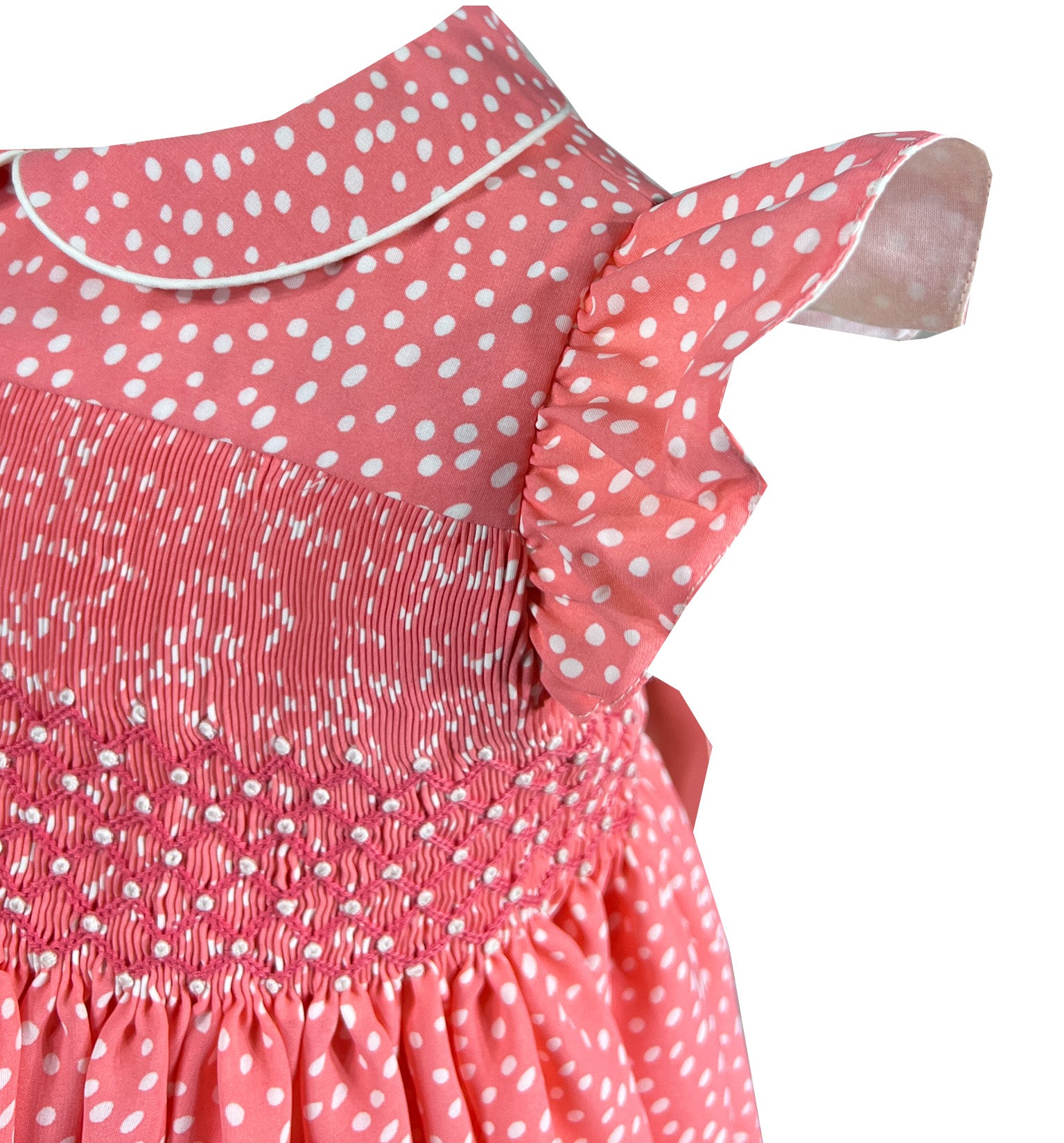 Joyeuse et pleine d'entrain, cette robe est réalisée dans un tissu doux et fluide. Son fond rose corail est parsemé de pois blancs. Le corsage smocké présente un motif géométrique ponctué de points blancs à chaque intersection, créant un jeu ludique entre structure et fantaisie.