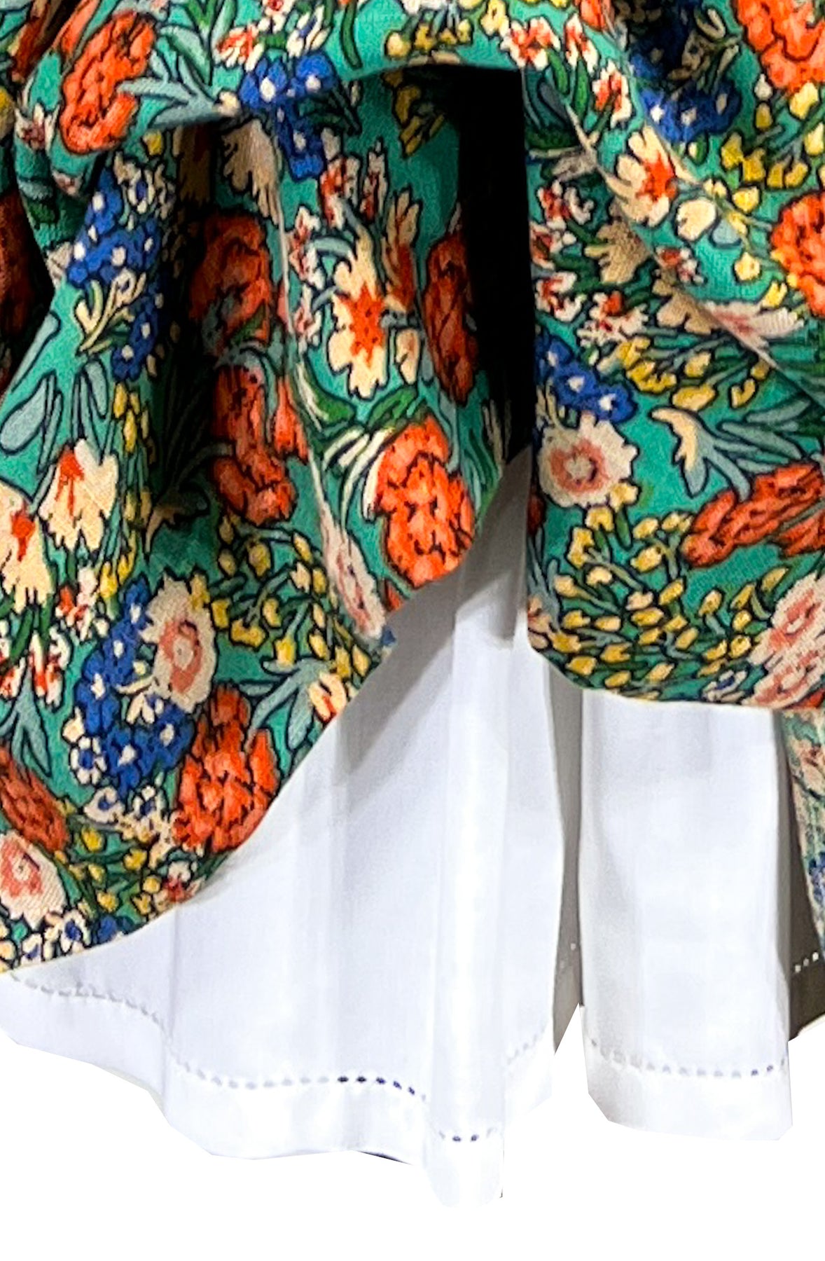Cette robe s'inspire de la palette vibrante des œuvres florales les plus célèbres de Van Gogh. Le tissu en coton souple et fluide, présente une abondance de fleurs corail, orange, jaune or et pêche douce sur un fond de vert canard vif. Le motif floral complexe crée un effet de tapisserie, où roses, fleurs sauvages et brindilles délicates s'entrelacent dans une profusion joyeuse.