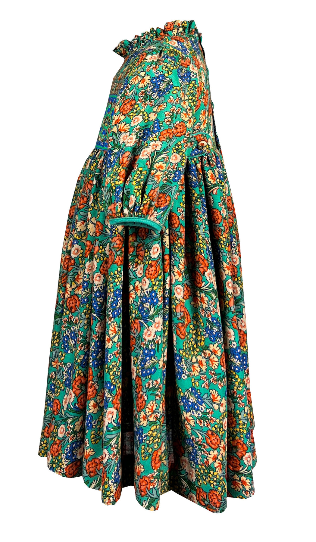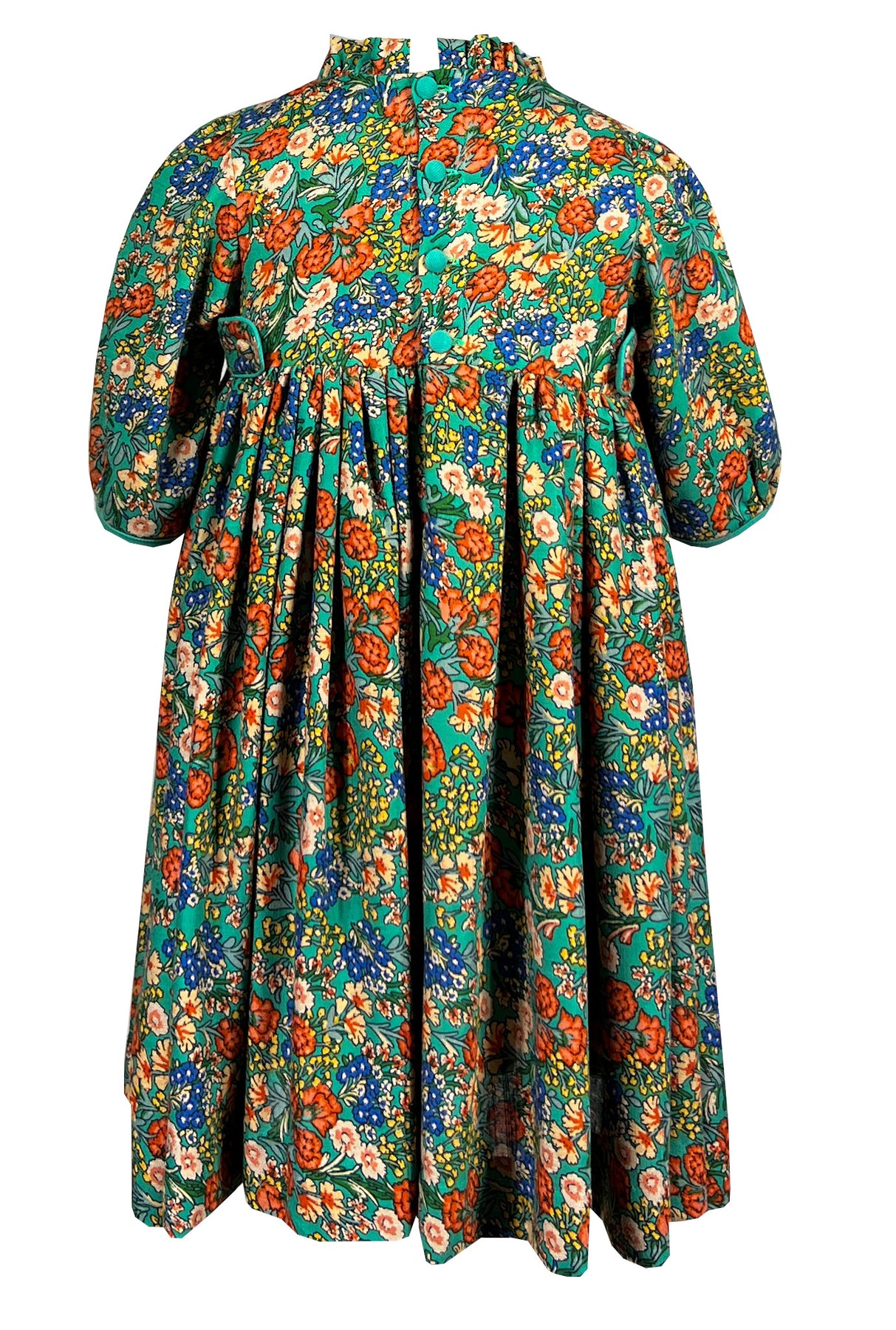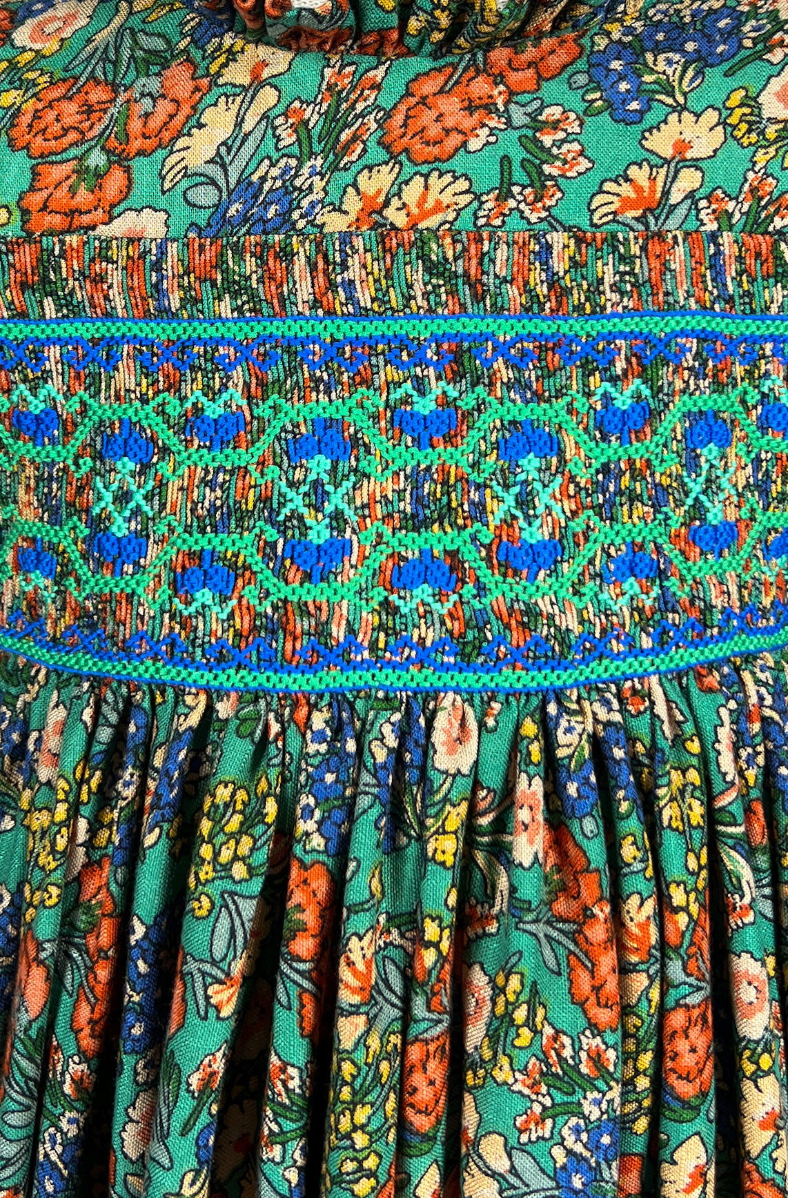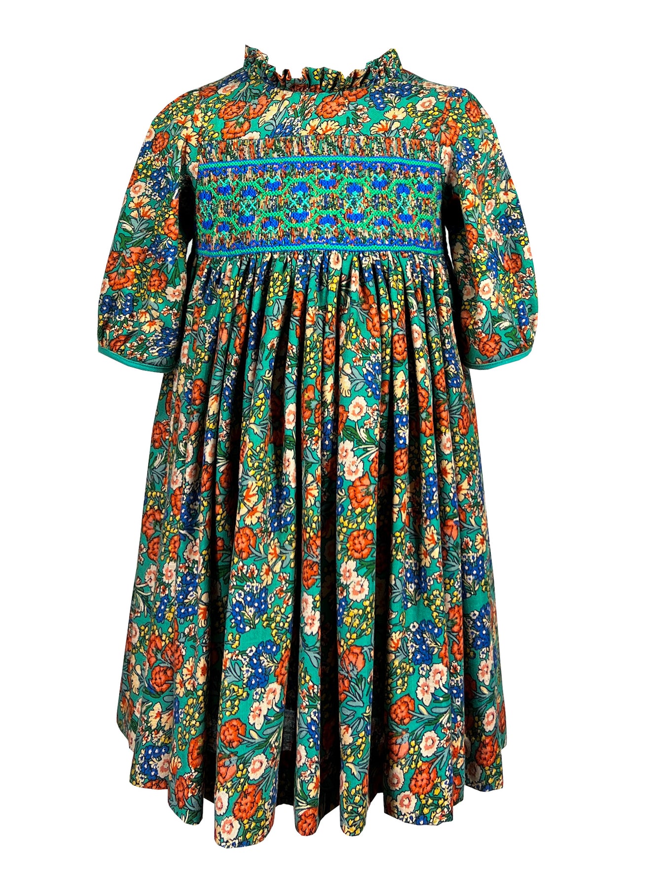 La robe présente nos intemporels smocks faits main sur la poitrine dans un motif géométrique, exécutés dans des fils bleu cobalt. Un charmant col volant montant encadre l'encolure. Les manches trois-quarts finies d'une bordure verte assortie aux boutons recouverts et à la veste coordonnée ajoutent volume et romantisme, tandis que la jupe généreusement froncée crée un beau mouvement à chaque pirouette. Des martingales ornent le profil de la robe.