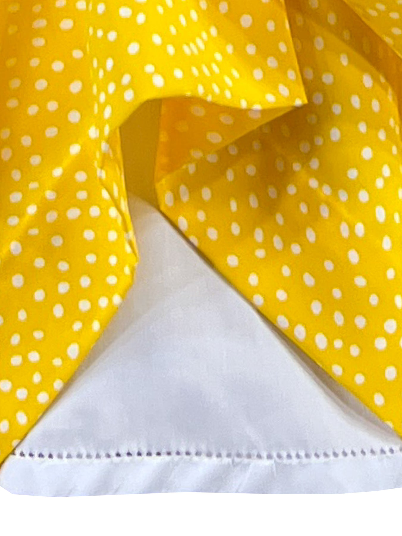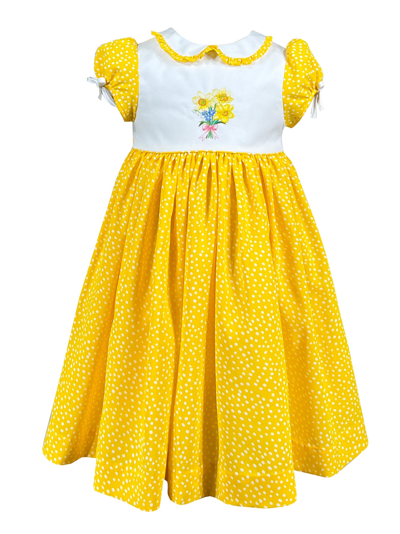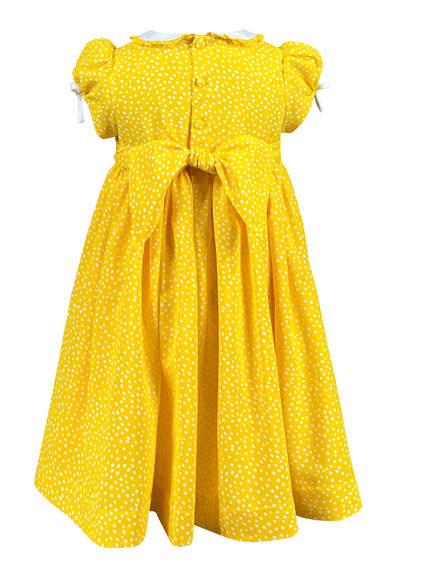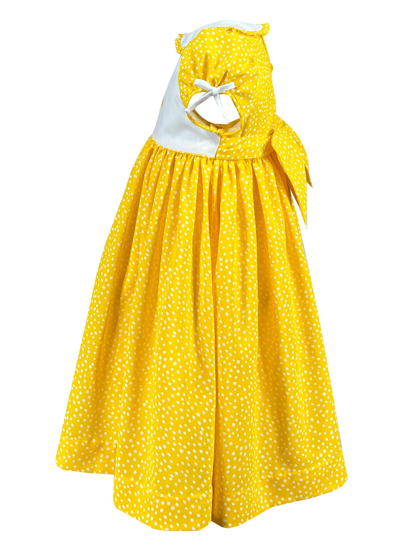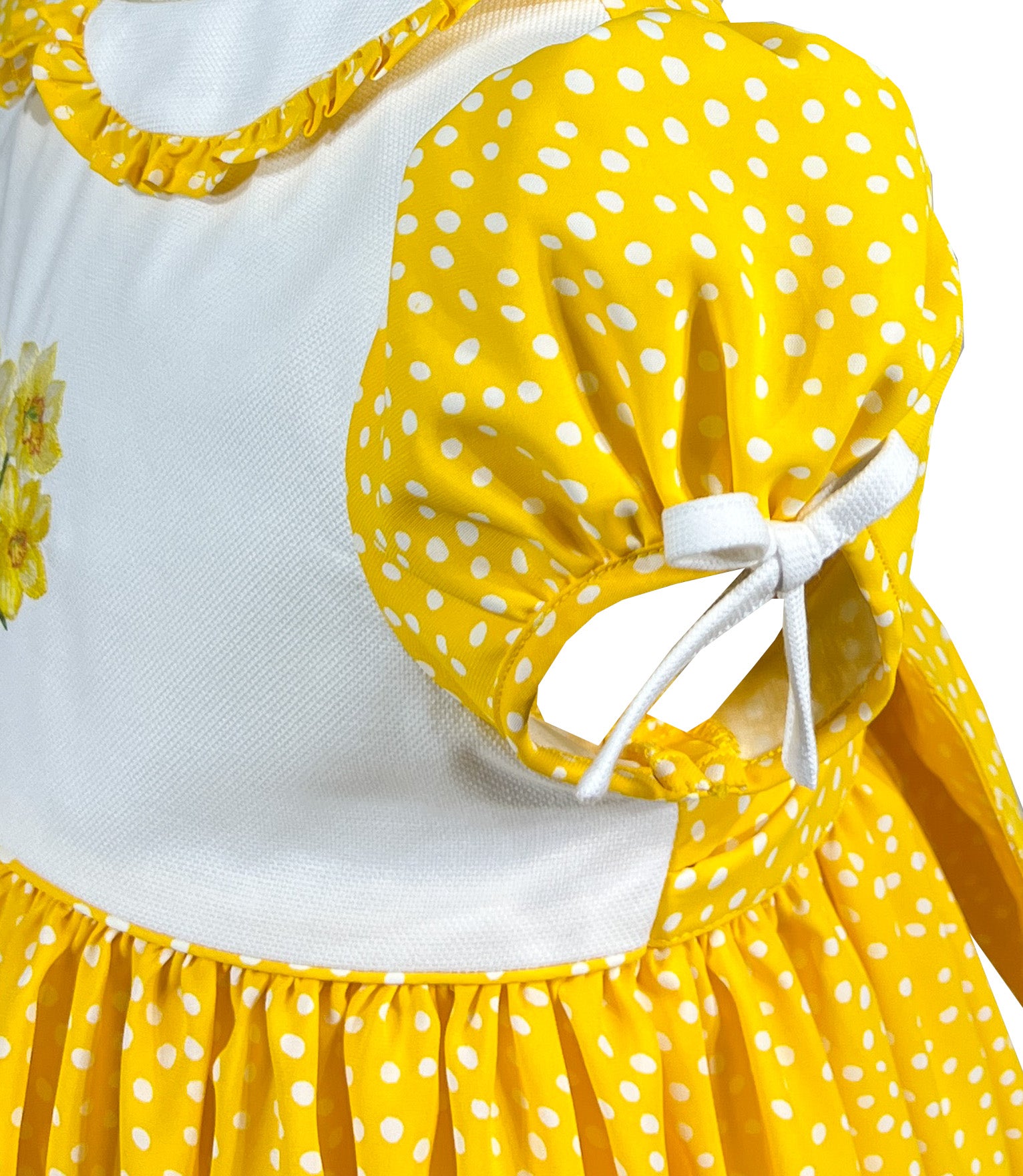 Rayonnante de joie dans son tissu jaune vif orné de pois blancs, elle allie le charme vintage à une touche de modernité. Le col Claudine d'un blanc éclatant est bordé de volants à pois assortis, tandis que les manches ballons sont ornées de délicats nœuds blancs.