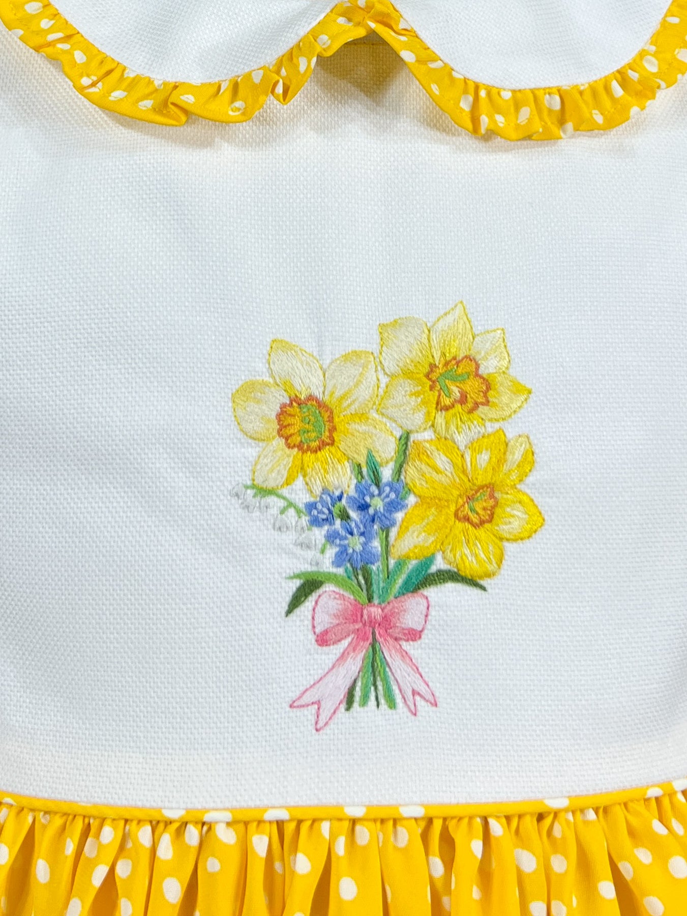 La pièce maîtresse est un extraordinaire bouquet brodé à la main : une véritable œuvre d'art composée de trois jonquilles dorées aux pétales en relief dans des tons de jaune et de crème, dont le centre est brodé d'orange et de vert vifs. Nichés parmi elles, de délicats myosotis bleus et des muguets sont liés ensemble par un nœud rose entièrement réalisé à la main. Chaque pétale, chaque feuille, chaque pli du ruban représente des heures de travail minutieux. Une ceinture assortie est nouée en forme de nœud papillon, et des boutons recouverts de tissu complètent la silhouette.