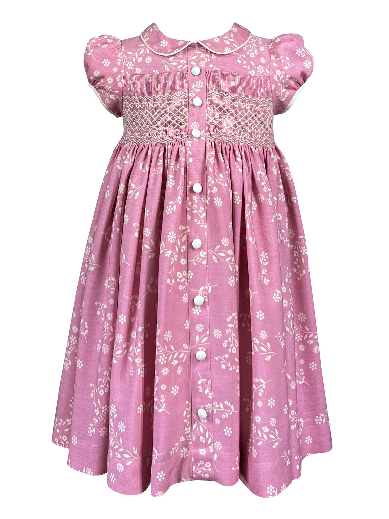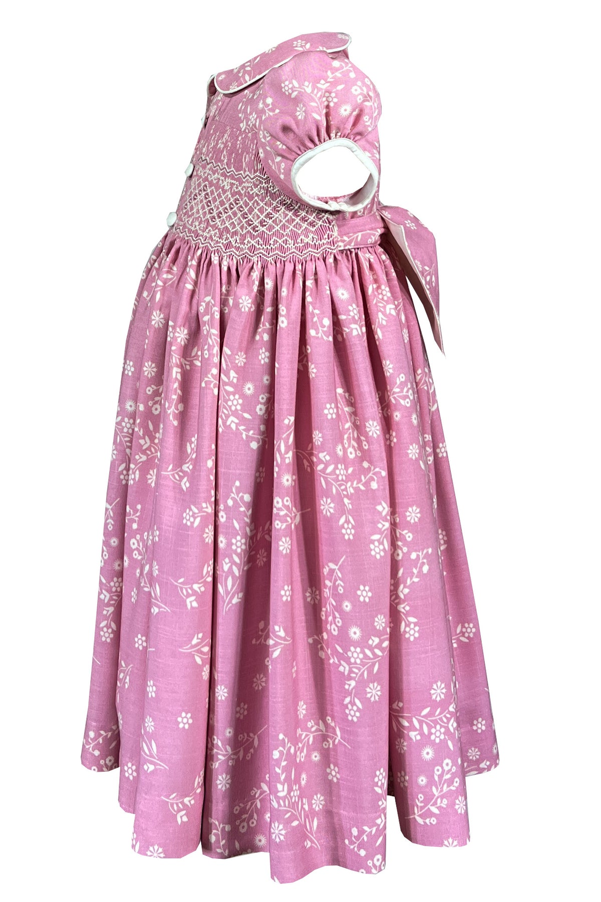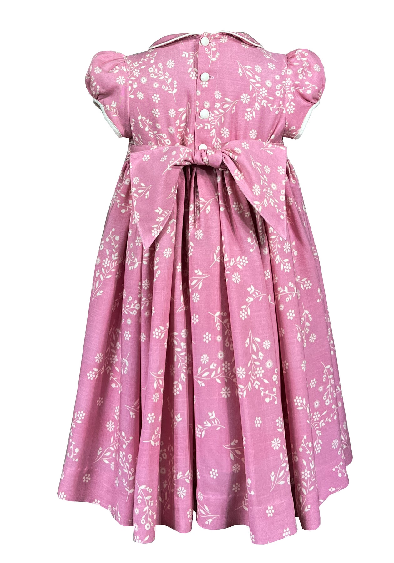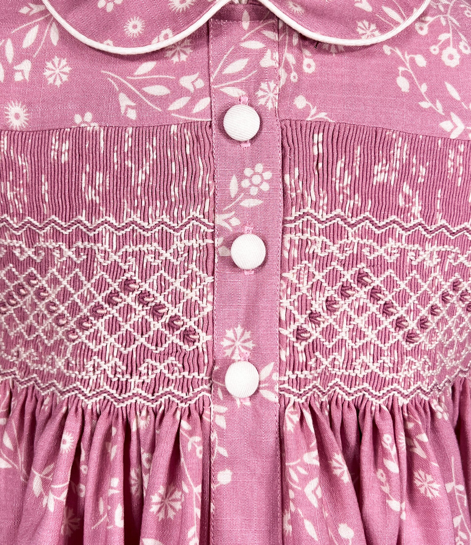 Véritable trésor d'une autre époque, la robe Rose Antique incarne l'élégance intemporelle dans la plus belle nuance de rose aux accents mauves. De délicates vignes fleuries blanches parsèment le tissu, créant un motif romantique d'inspiration vintage.