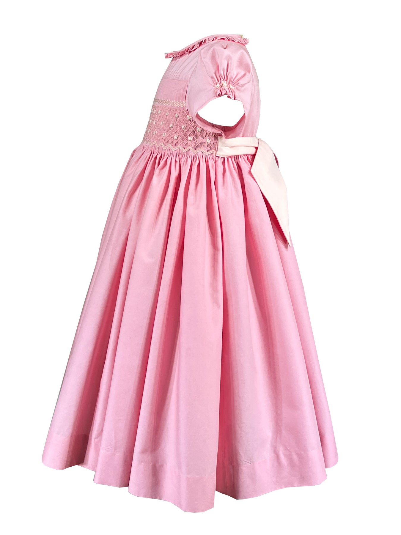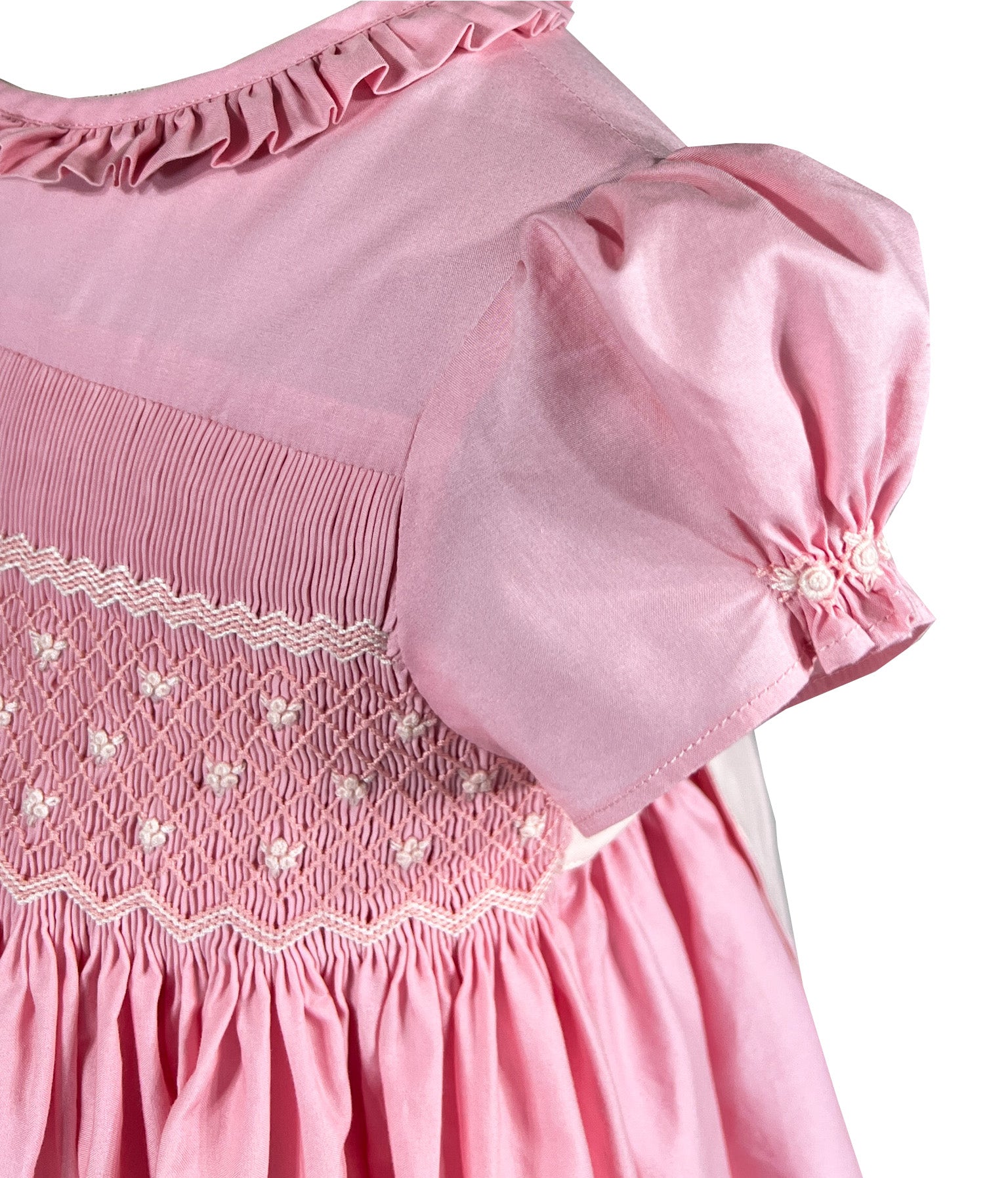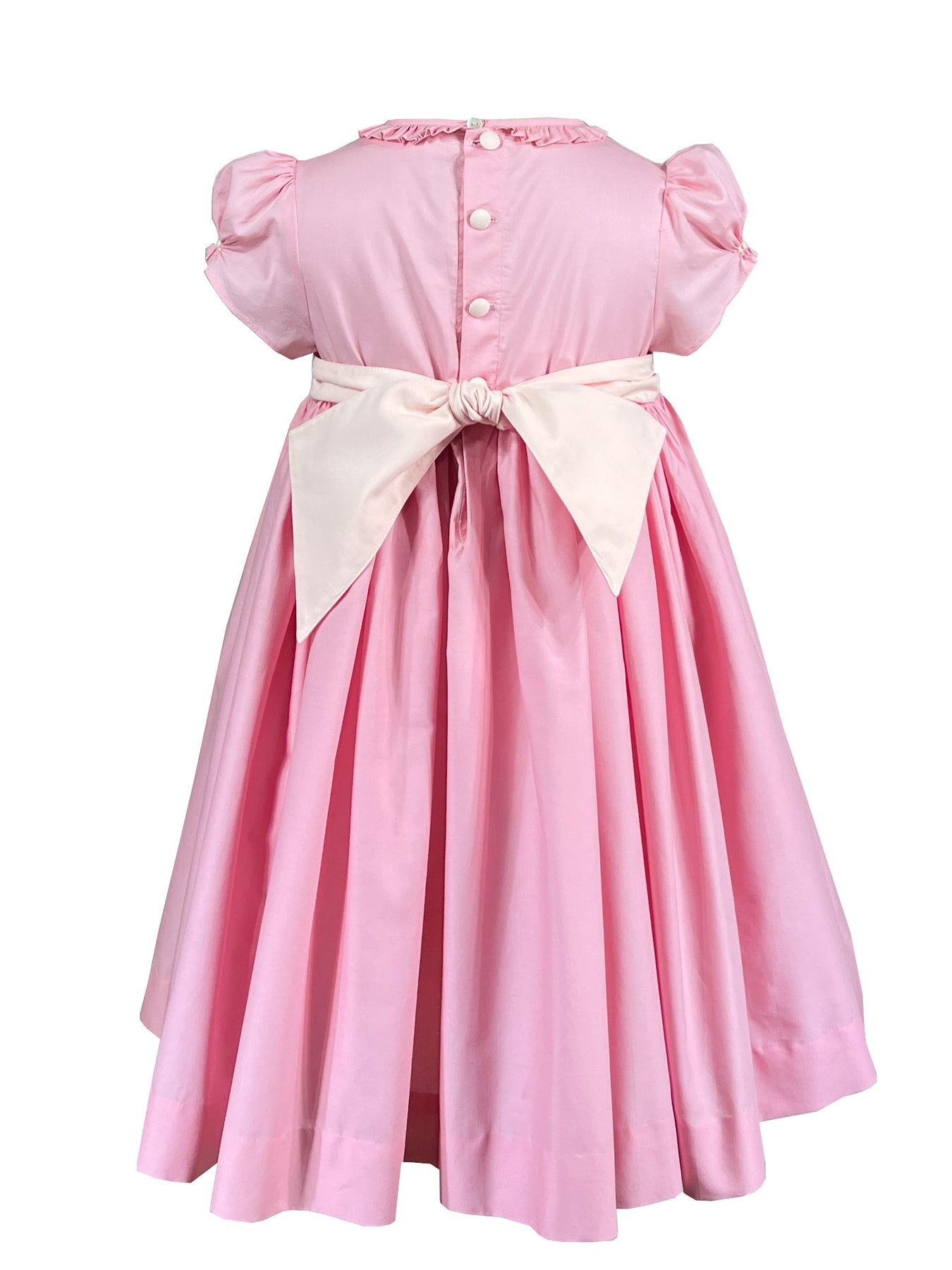 The signature puffed sleeves are gathered at the cuffs with delicate rosebud embroideries, a charming detail that speaks to careful craftsmanship. A frilled pleated collar frames the neckline with romantic flair, while the pink and cream smocked bodice creates subtle texture. A butterfly bow sash at the back and self covered buttons complete this enchanting piece.