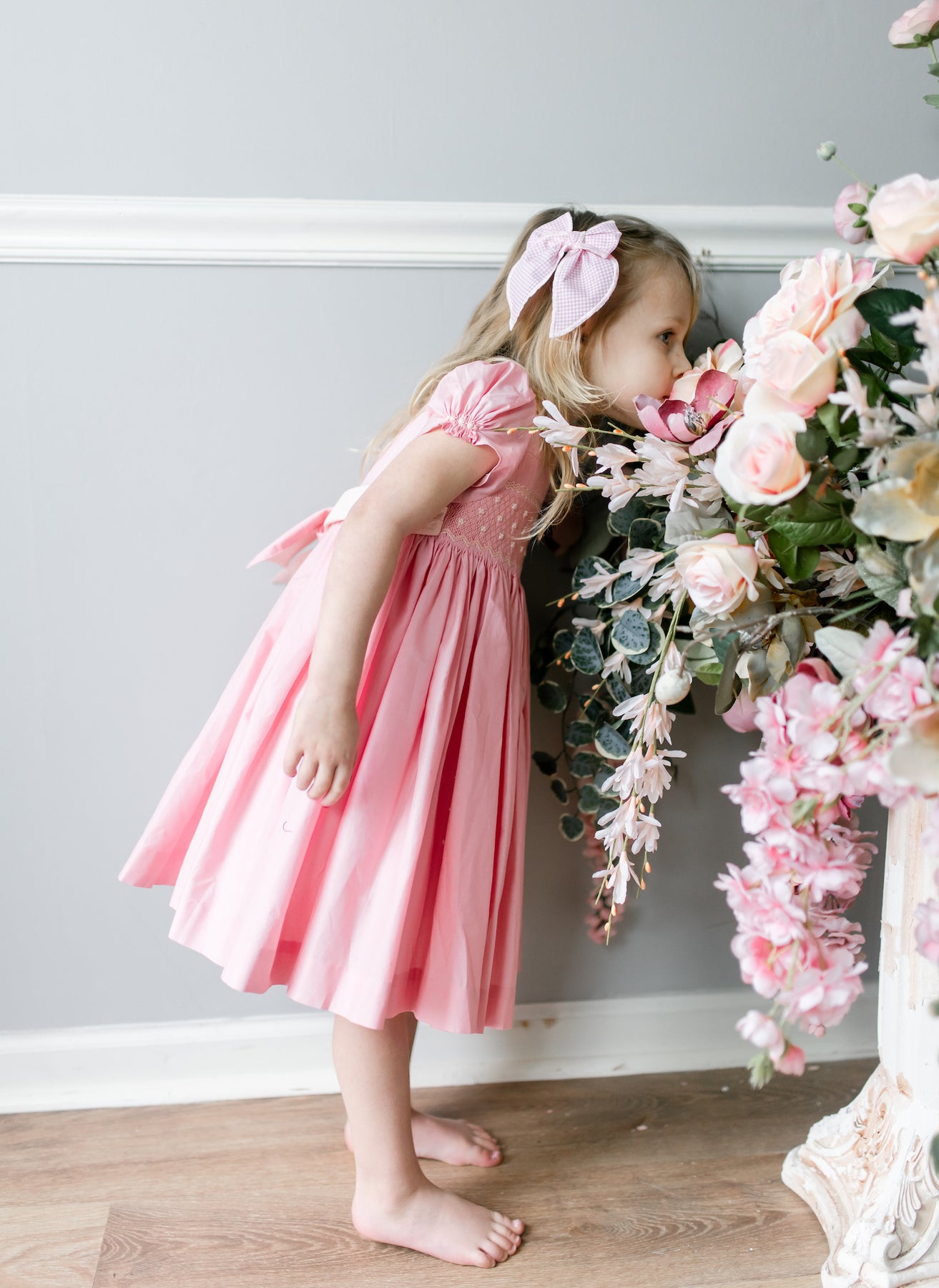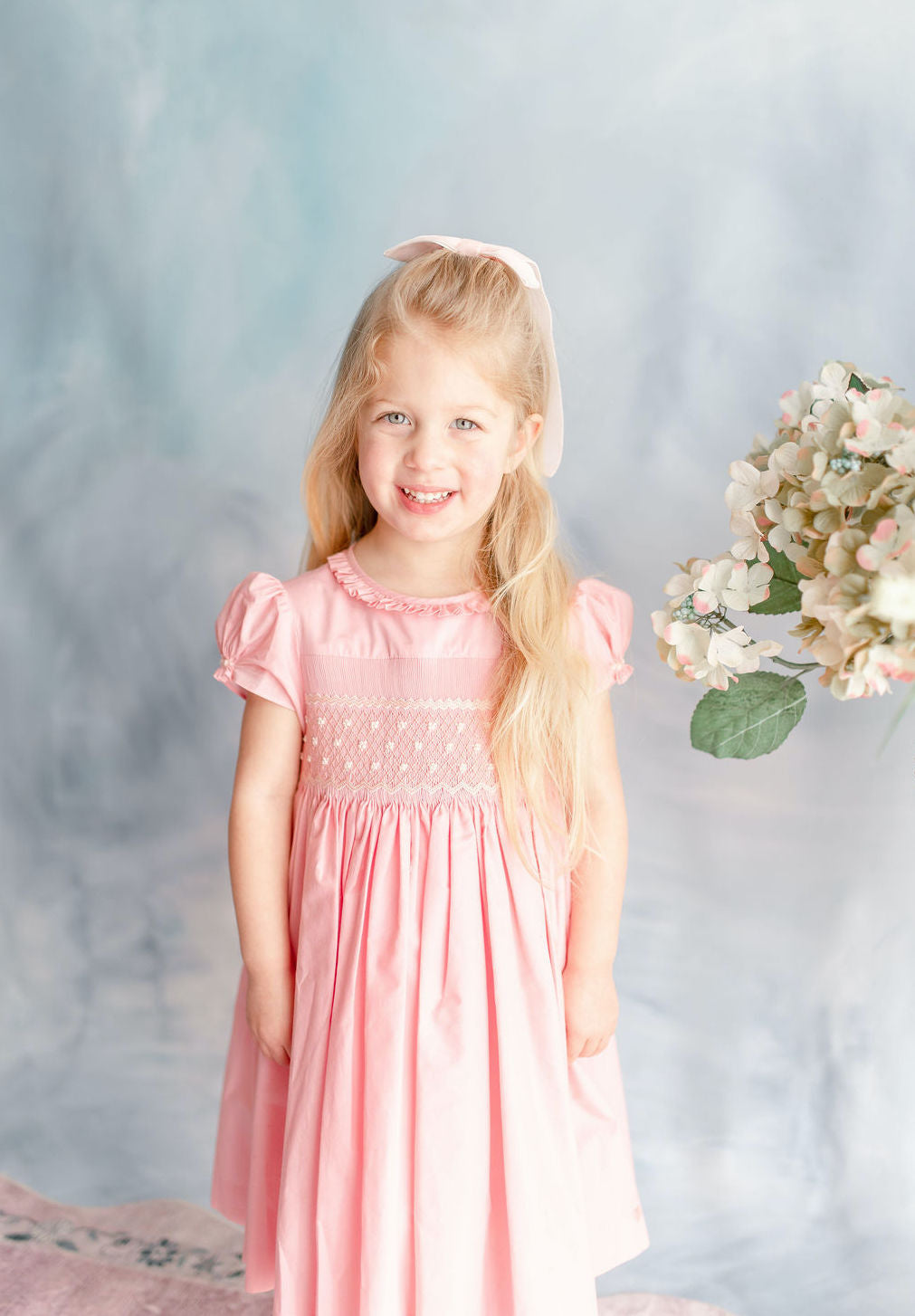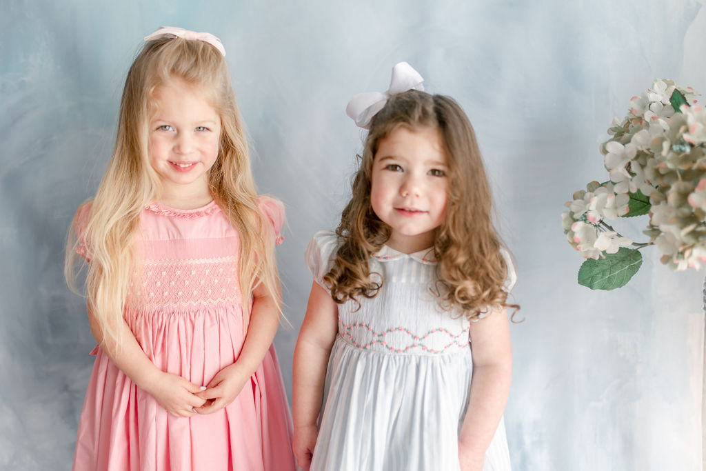 The signature puffed sleeves are gathered at the cuffs with delicate rosebud embroideries, a charming detail that speaks to careful craftsmanship. A frilled pleated collar frames the neckline with romantic flair, while the pink and cream smocked bodice creates subtle texture. A butterfly bow sash at the back and self covered buttons complete this enchanting piece.